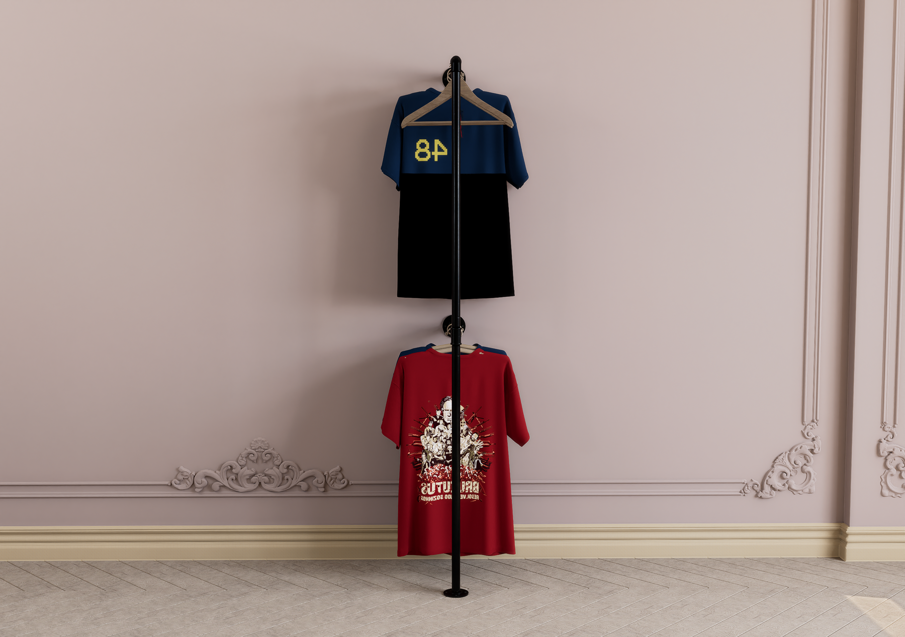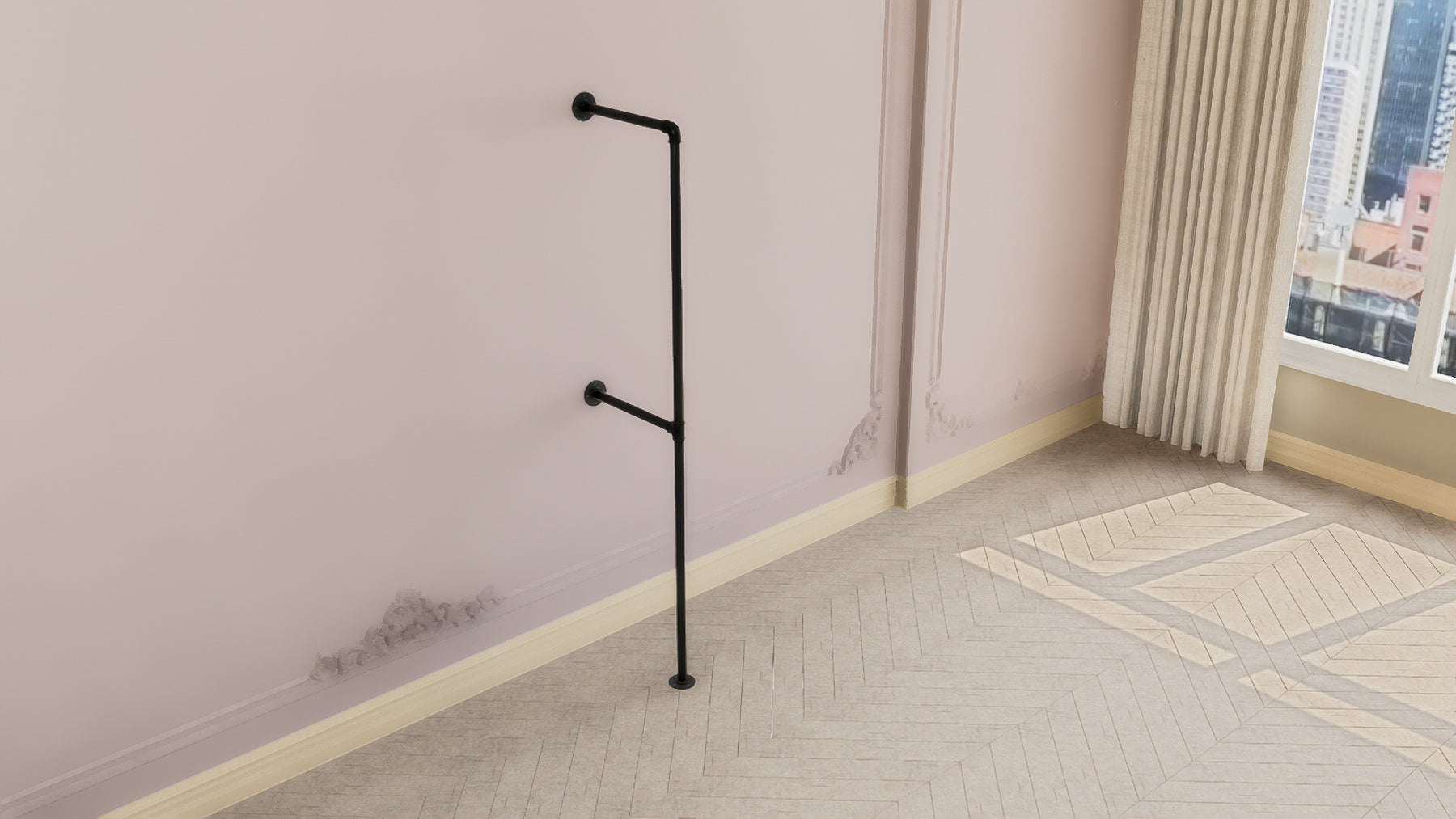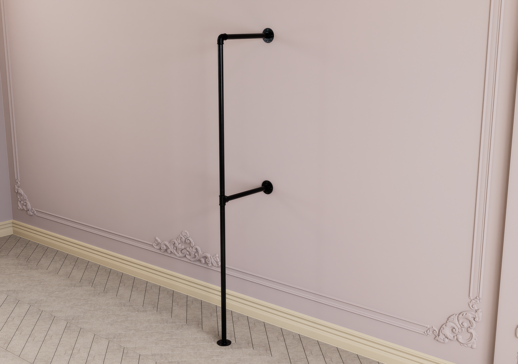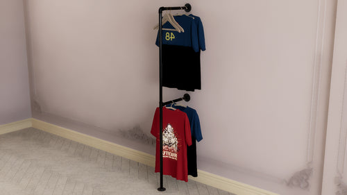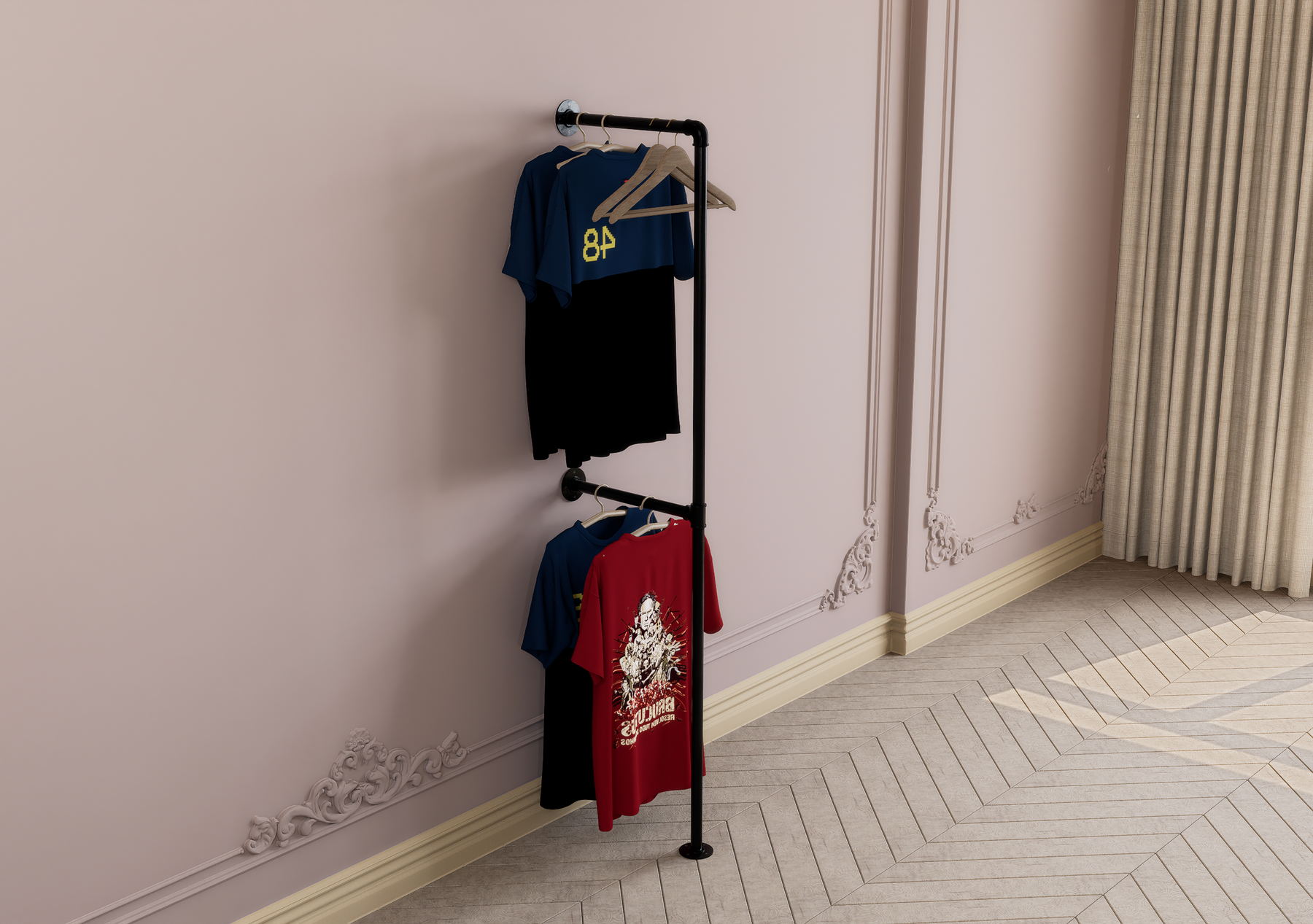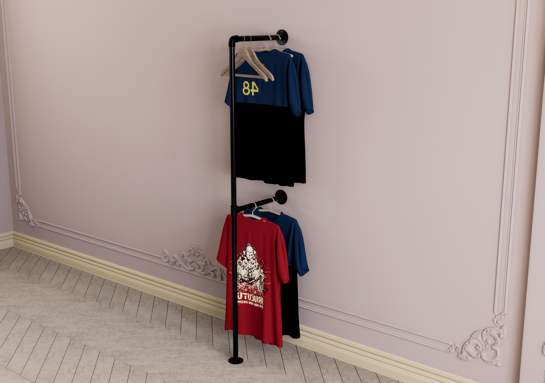 Introduce bold industrial style and smart storage to your space with this F-shaped wall and floor mounted clothes rack, crafted from durable black steel pipe. Designed to maximise vertical space, this cleverly constructed rack features a strong vertical pipe anchored to both wall and floor, with two horizontal arms — one at the top and one at the middle — that act as practical hanging rails.