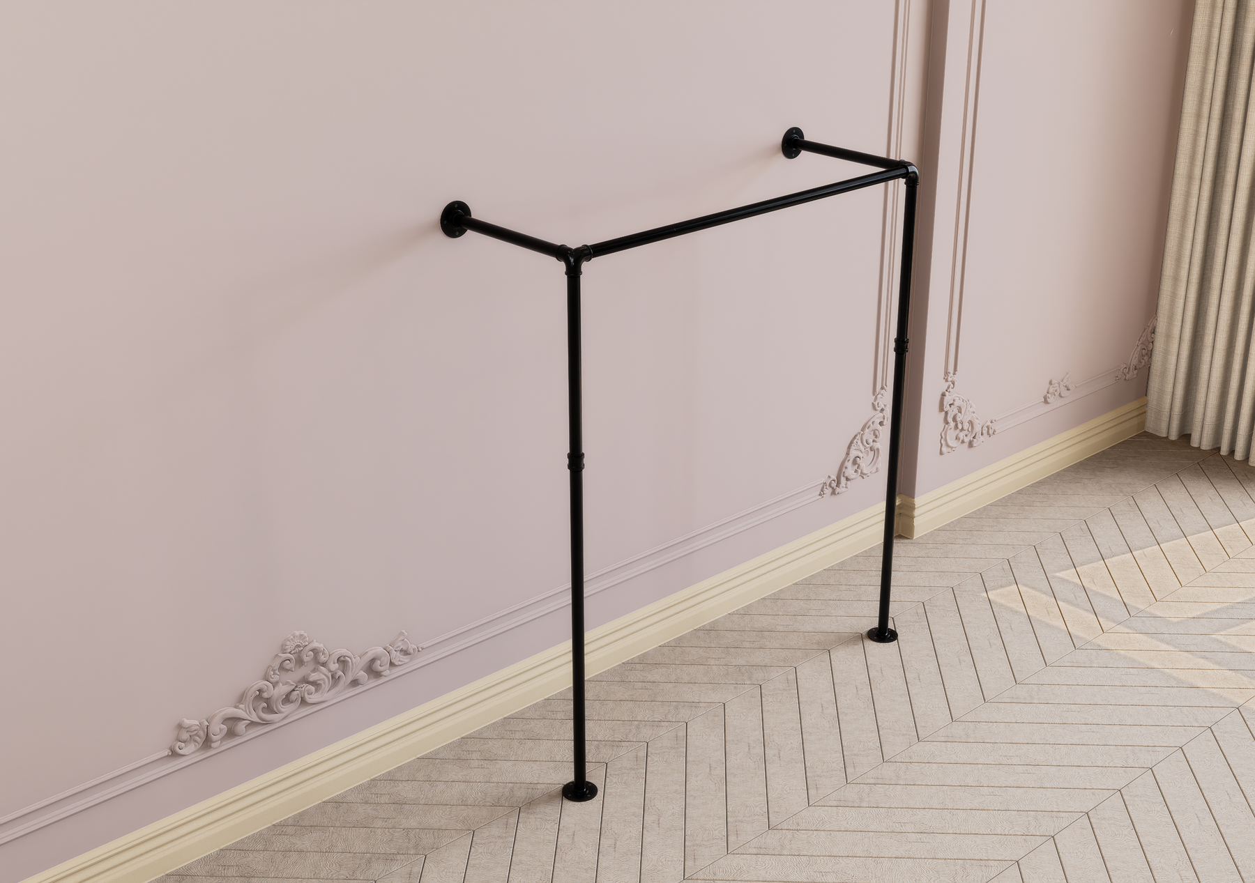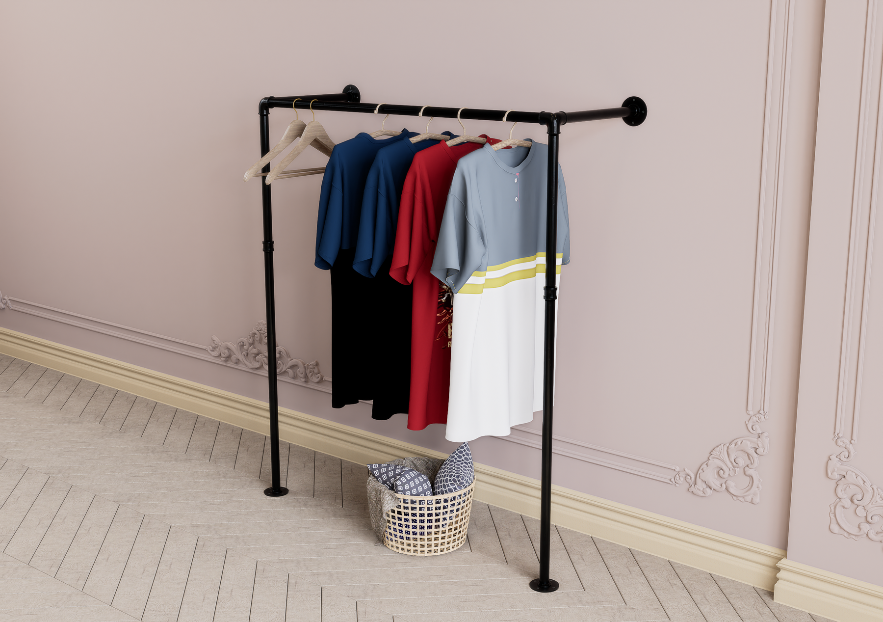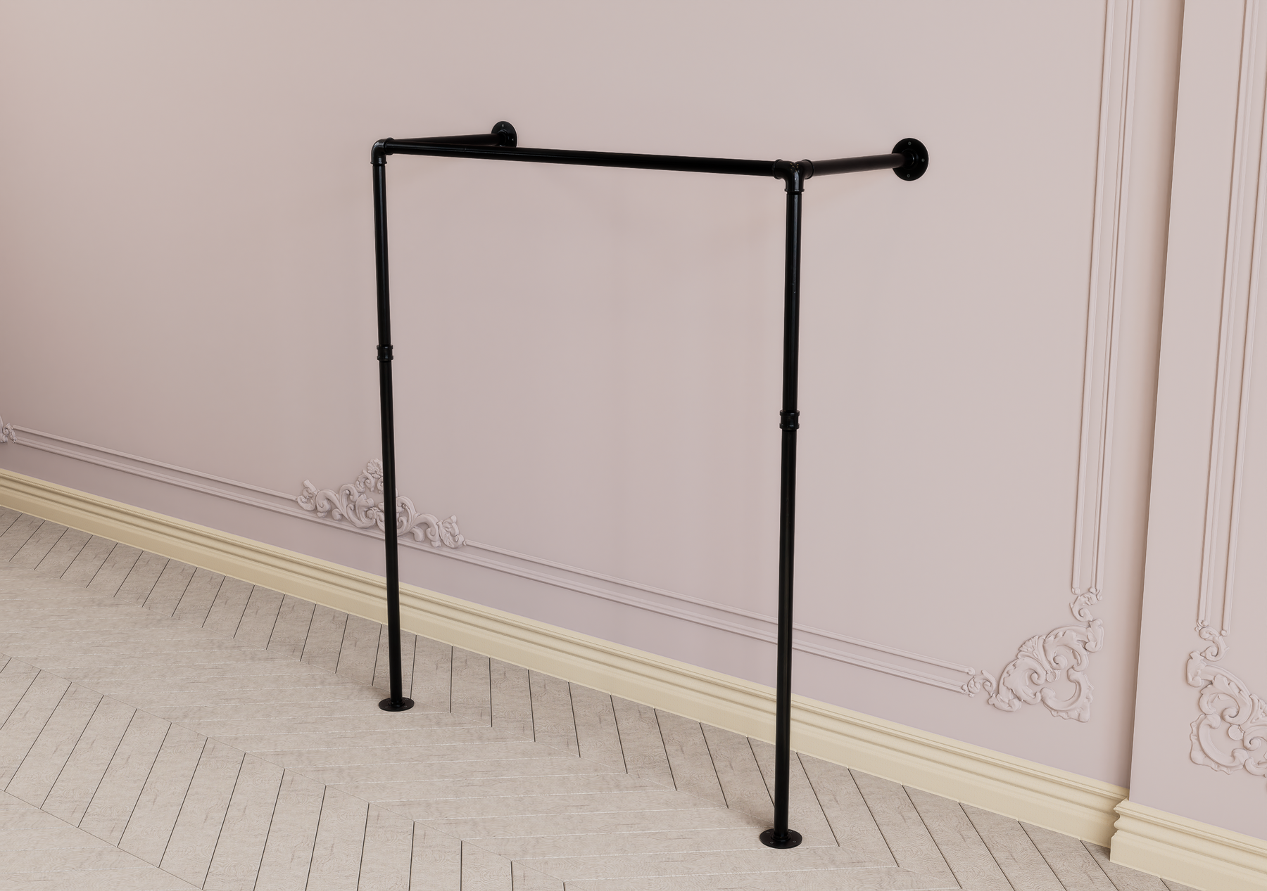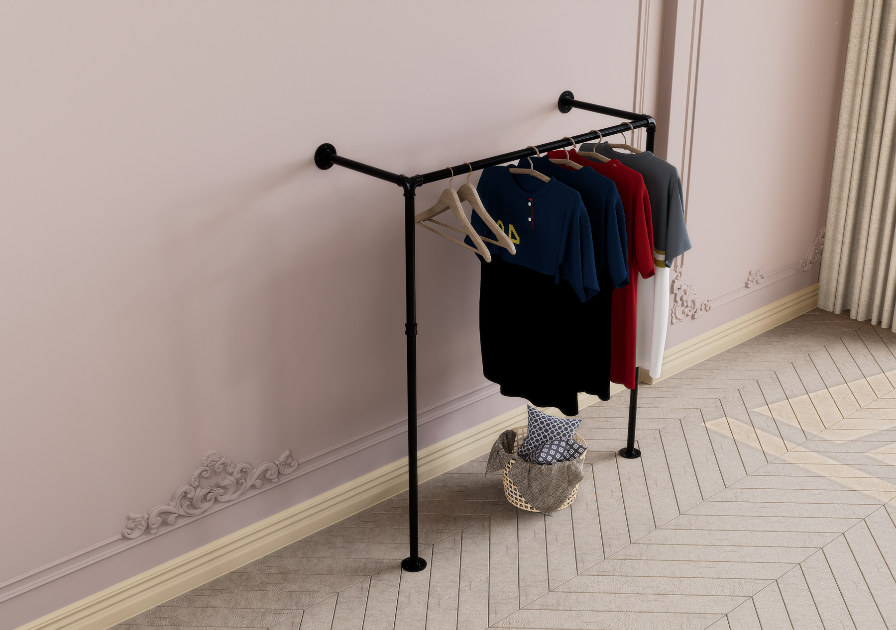 Maximize your wardrobe space with this industrial pipe wall and floor mounted clothes rack — engineered for style and strength. Crafted from durable black metal pipes, it blends minimalist elegance with practicality, offering a segmented design to easily organize your clothing. Whether for your bedroom, closet, or boutique, this rack transforms storage into a statement.