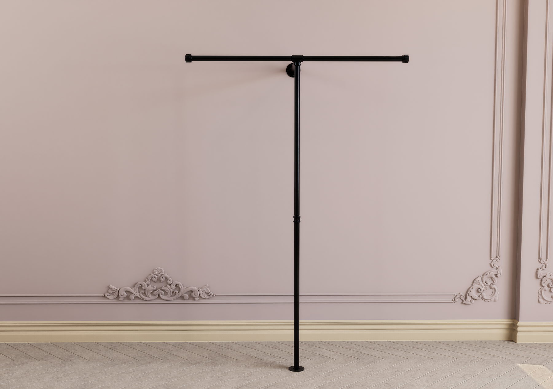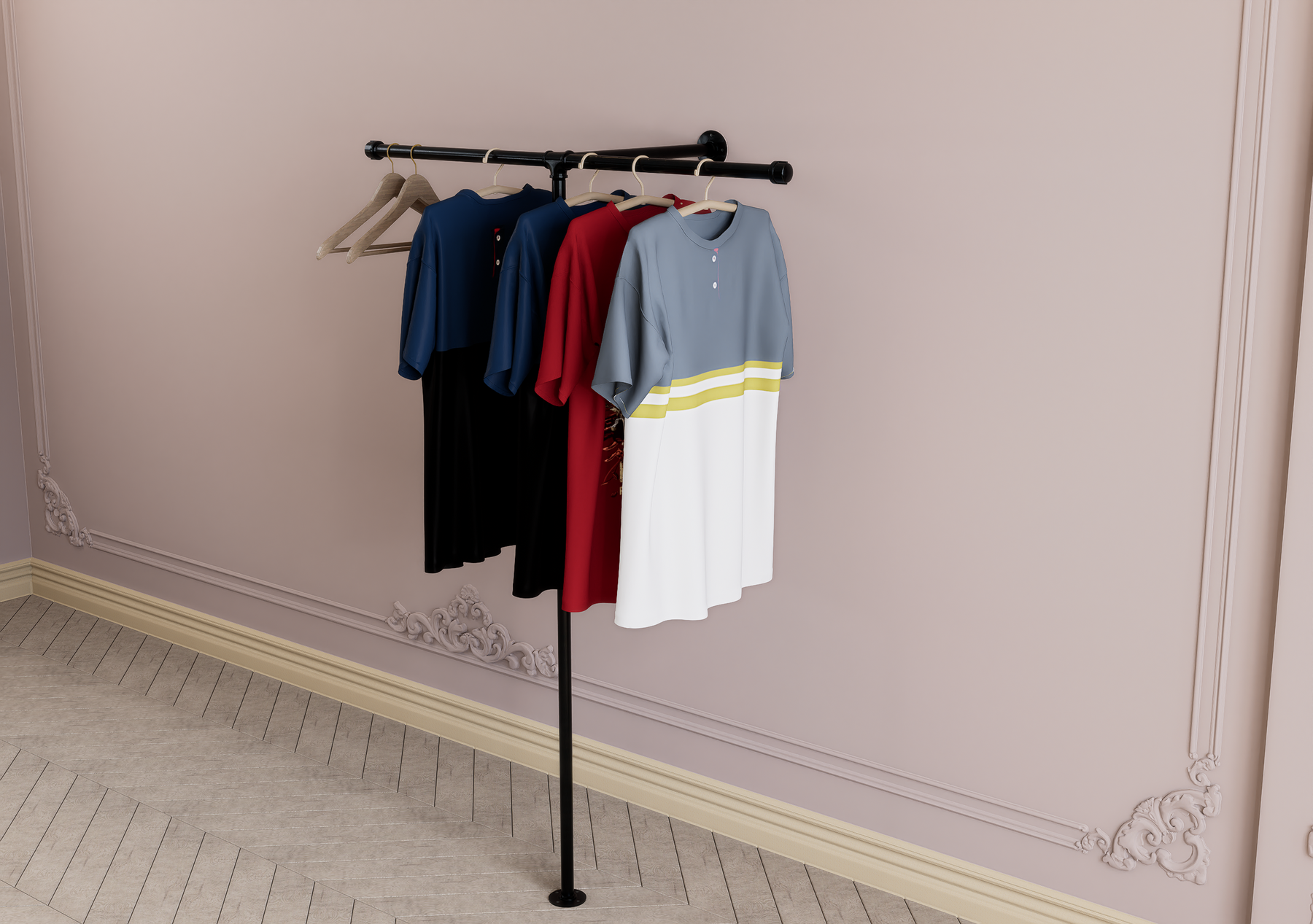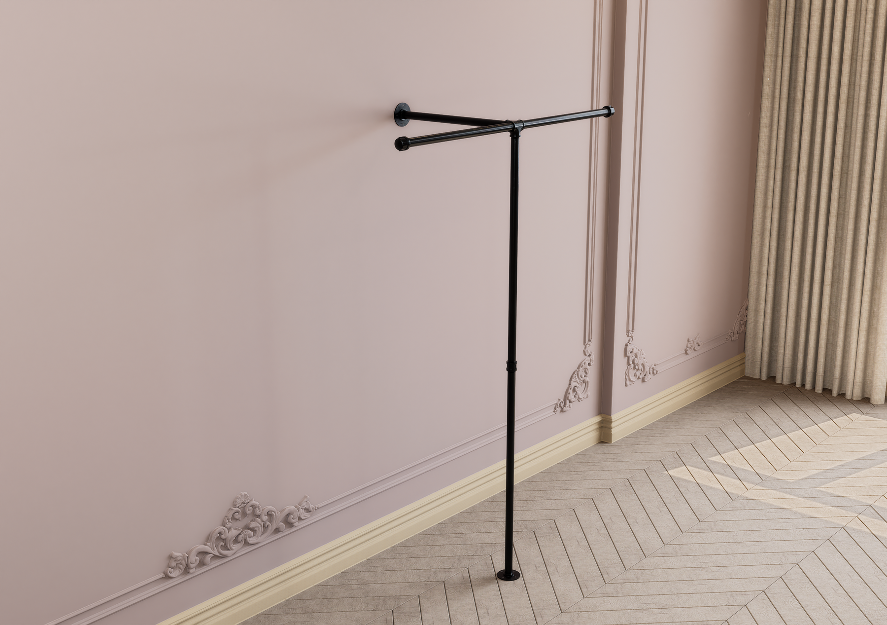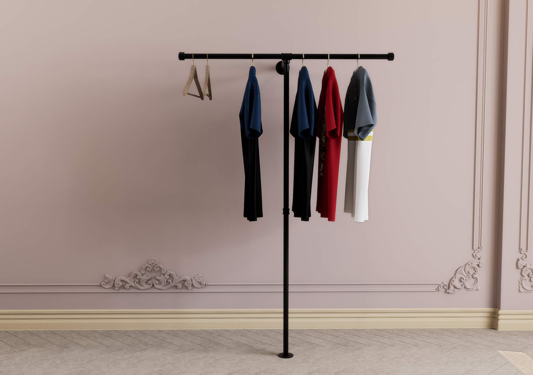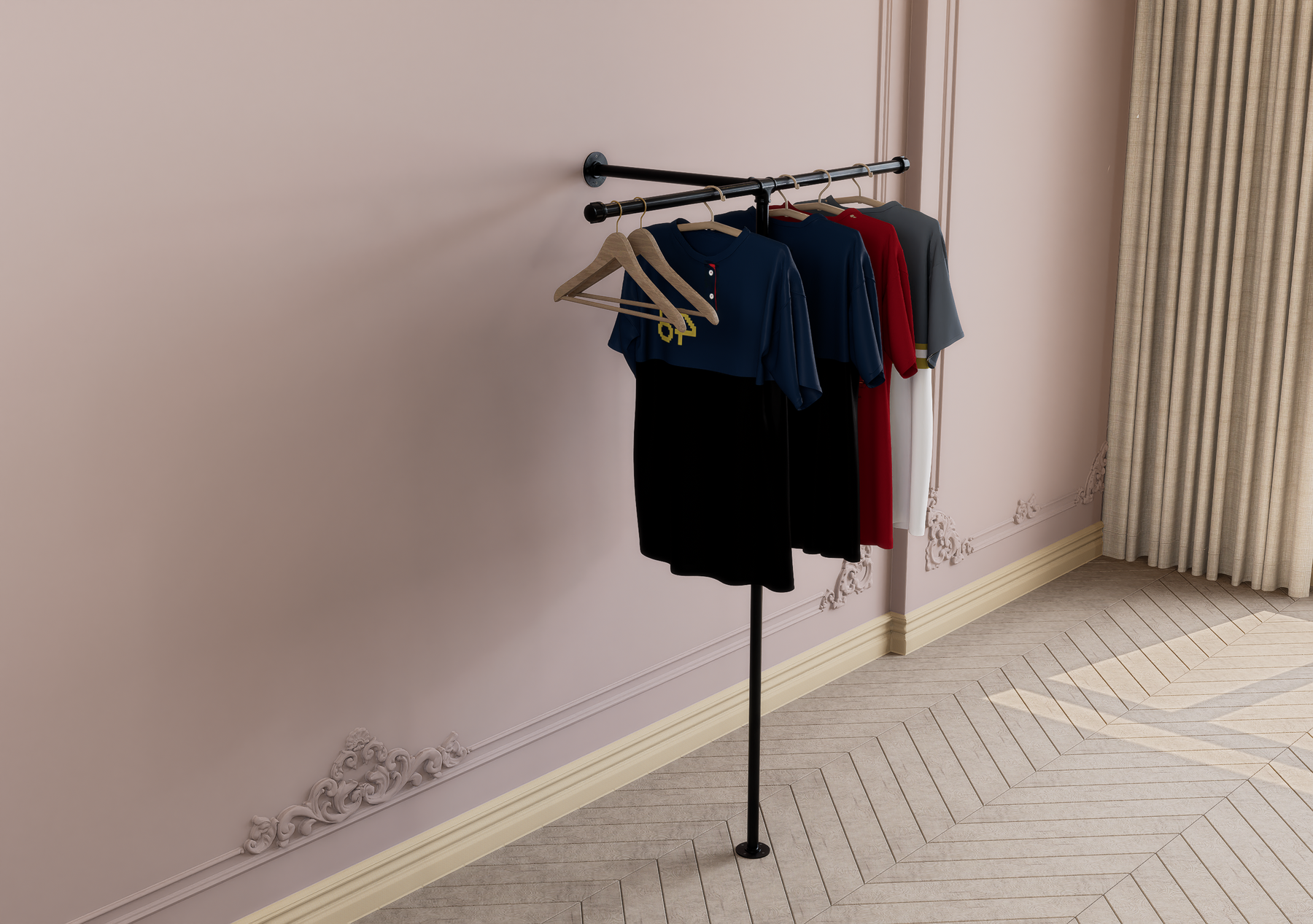 Unleash sleek functionality and industrial charm with this expertly crafted floor and wall-mounted clothes rack. Featuring a distinctive “trident” design, this unit combines style with purpose. Two sturdy horizontal arms branch elegantly from the central support pole, providing ample space to display or store garments while maintaining a clean, minimal footprint. The third vertical pole secures directly to the wall, ensuring enhanced stability and a striking architectural look.