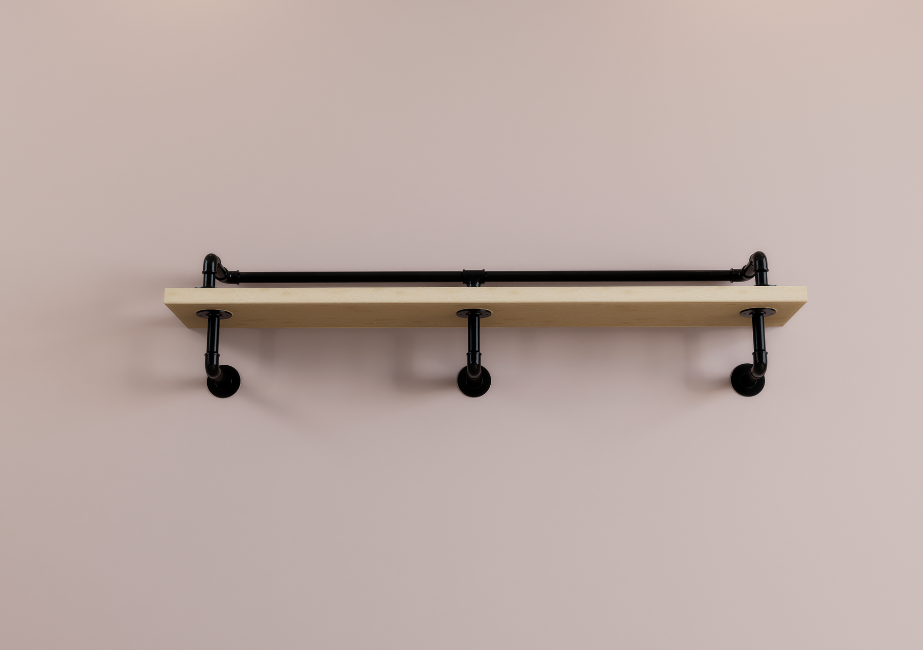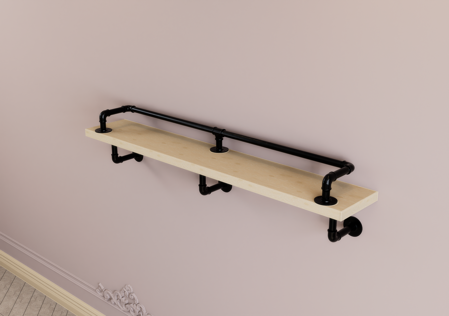 Add stylish and functional storage to any space with this single-tier wall-mounted shelf, crafted from durable black pipe brackets and a smooth wood shelf. Designed with a protective railing above the wood, it keeps your items secure and adds a modern industrial touch.