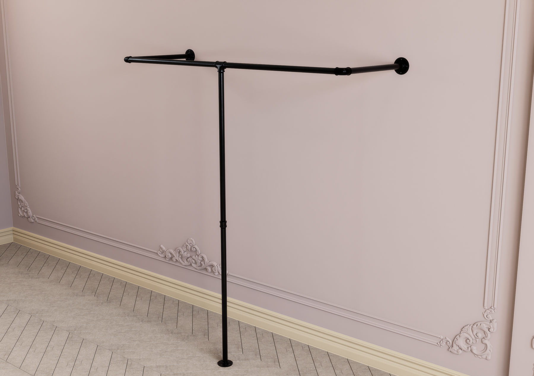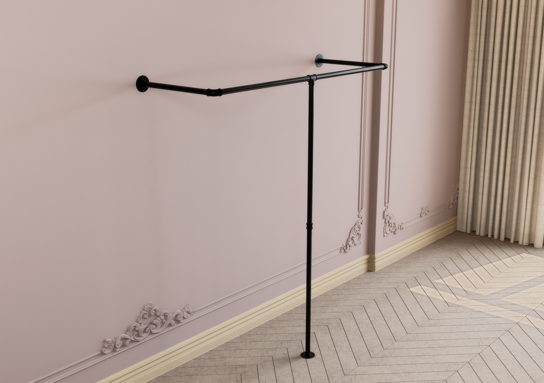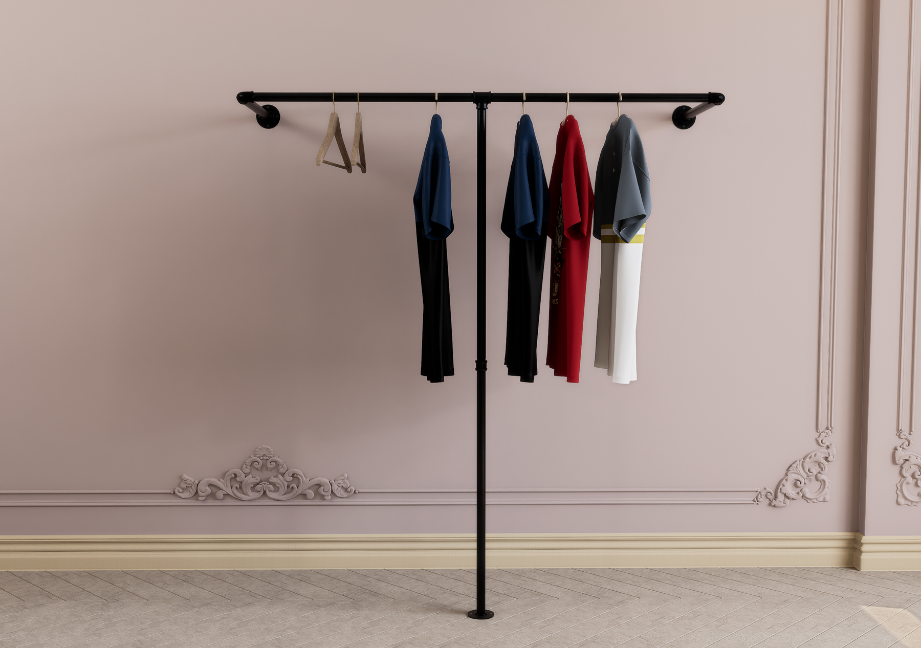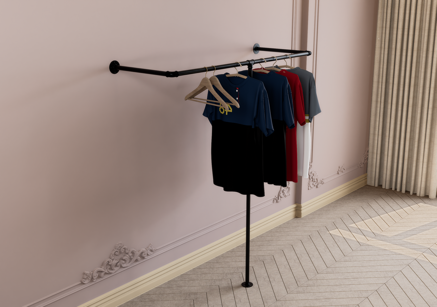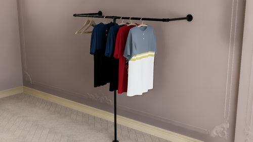 Bring effortless organization and rugged industrial charm to your space with this wall and floor-mounted pipe clothes rack. Featuring a clever half-rectangle wraparound design, this rack maximises hanging space by allowing garments to be displayed from multiple angles. Perfect for bedrooms, boutiques, or minimalist interiors, it brings both form and function into focus with a bold, modern edge.