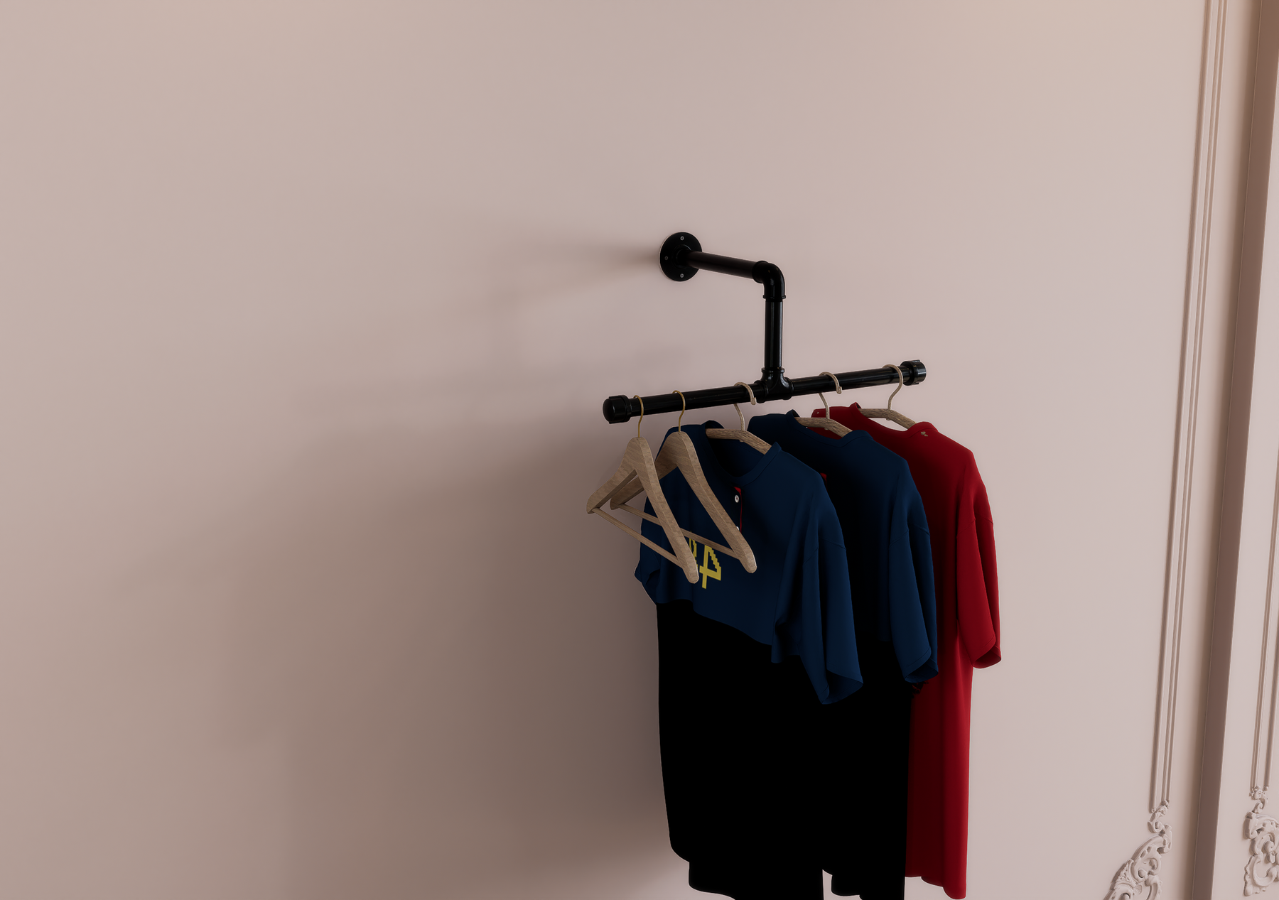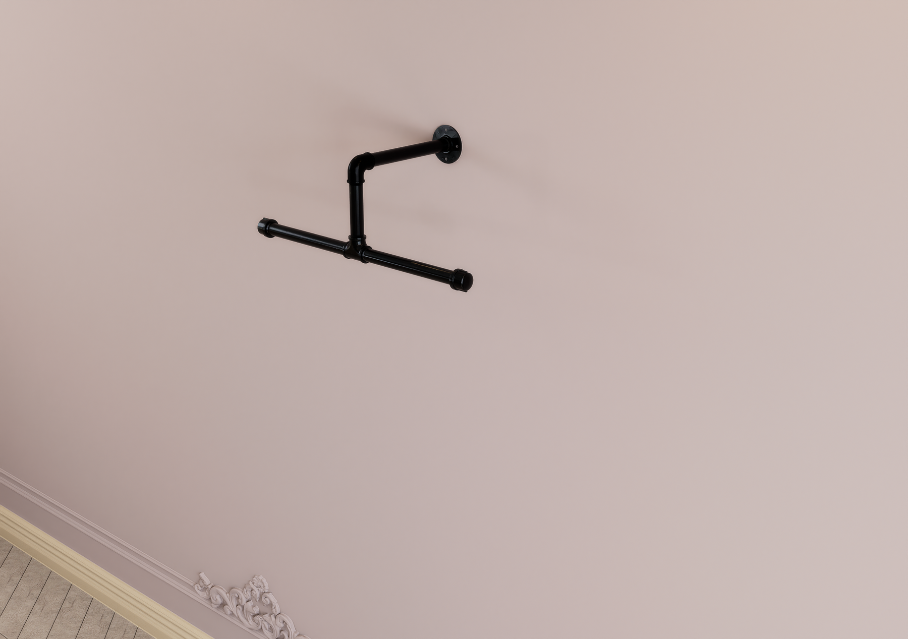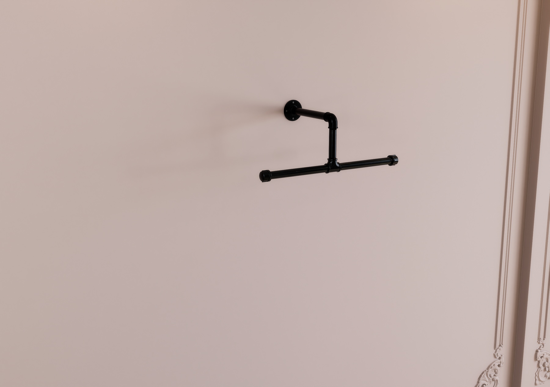 Maximise your space with this compact industrial clothes rack, crafted in a clever upside-down T shape with two horizontal arms for easy hanging. Perfectly sized for small spaces, entryways, closets, or even retail displays, this wall-mounted black steel pipe rack offers stylish storage without bulk.