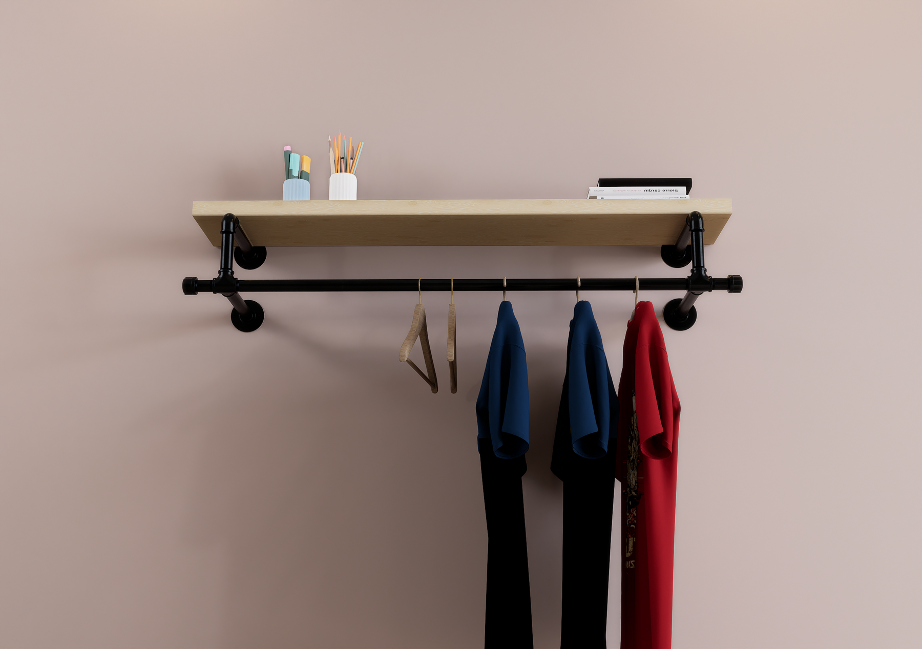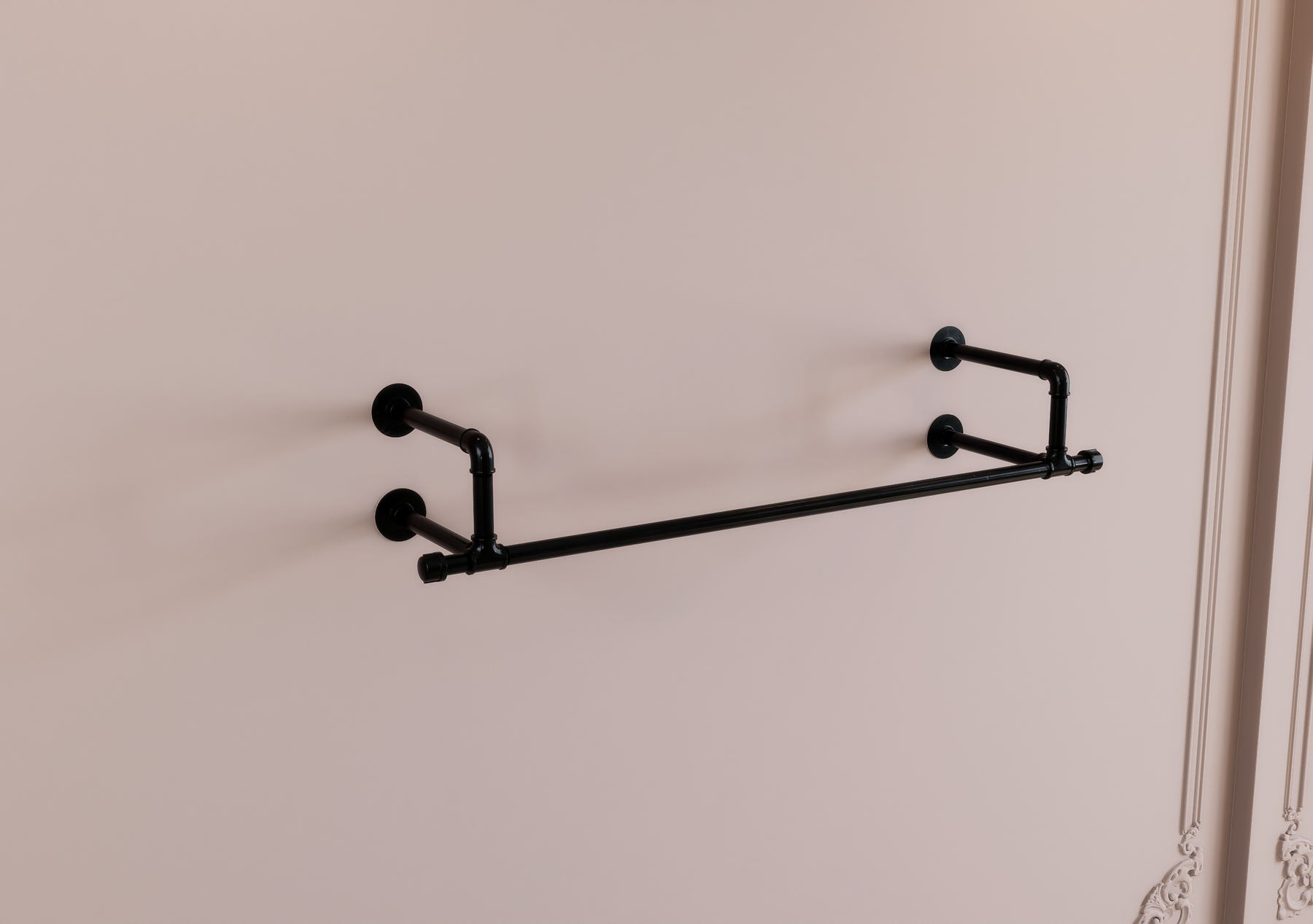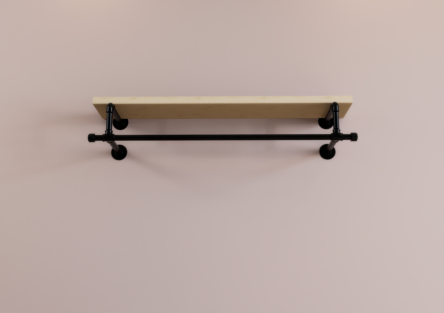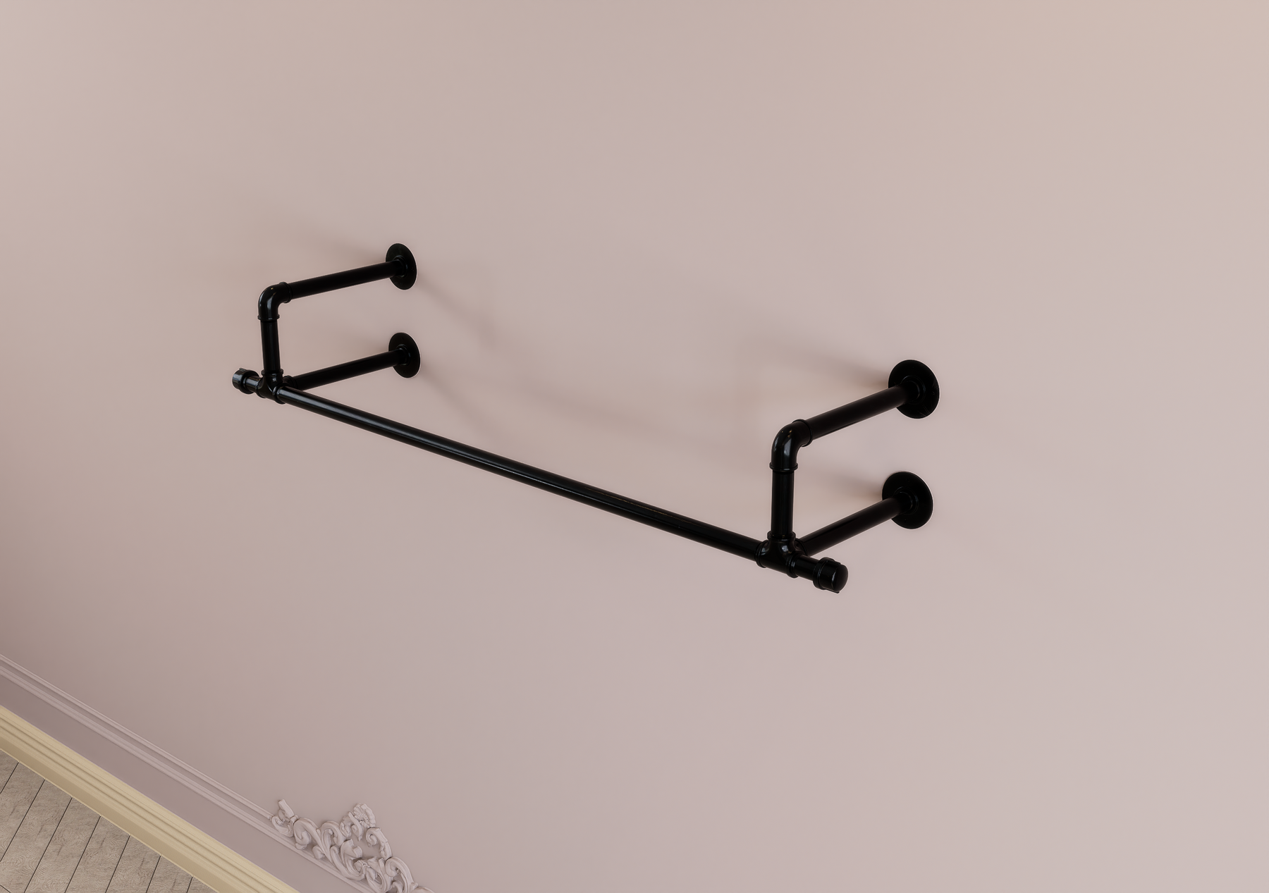 Create your own custom closet or display space with this industrial black pipe clothes rack — featuring two wall-mounted brackets connected by a horizontal hanging rail, and optional shelf support at the top of each bracket.