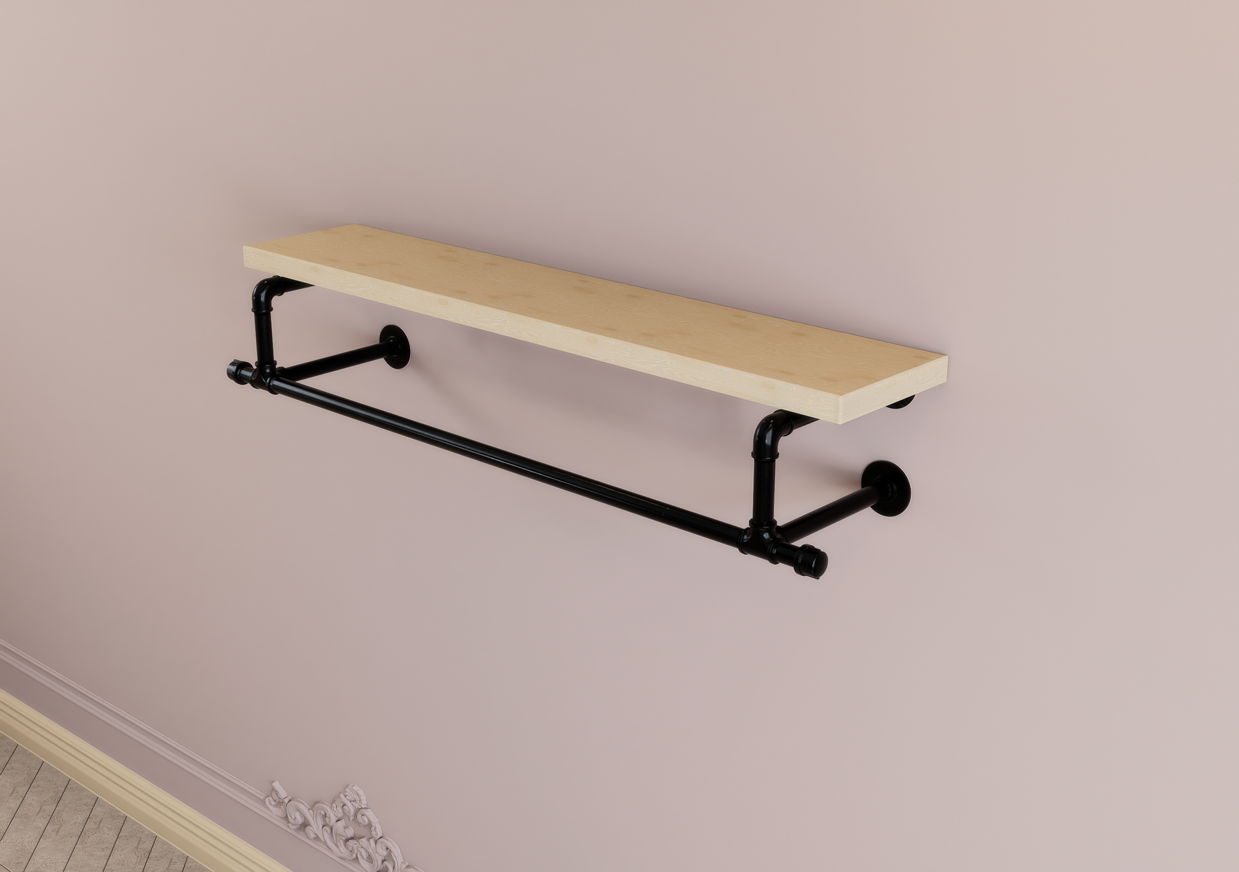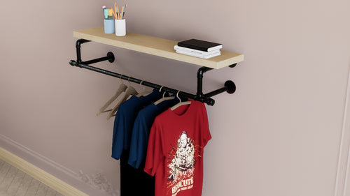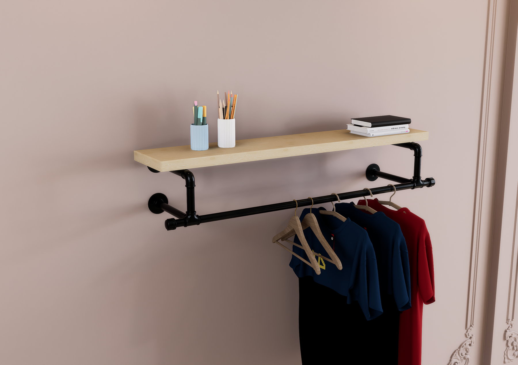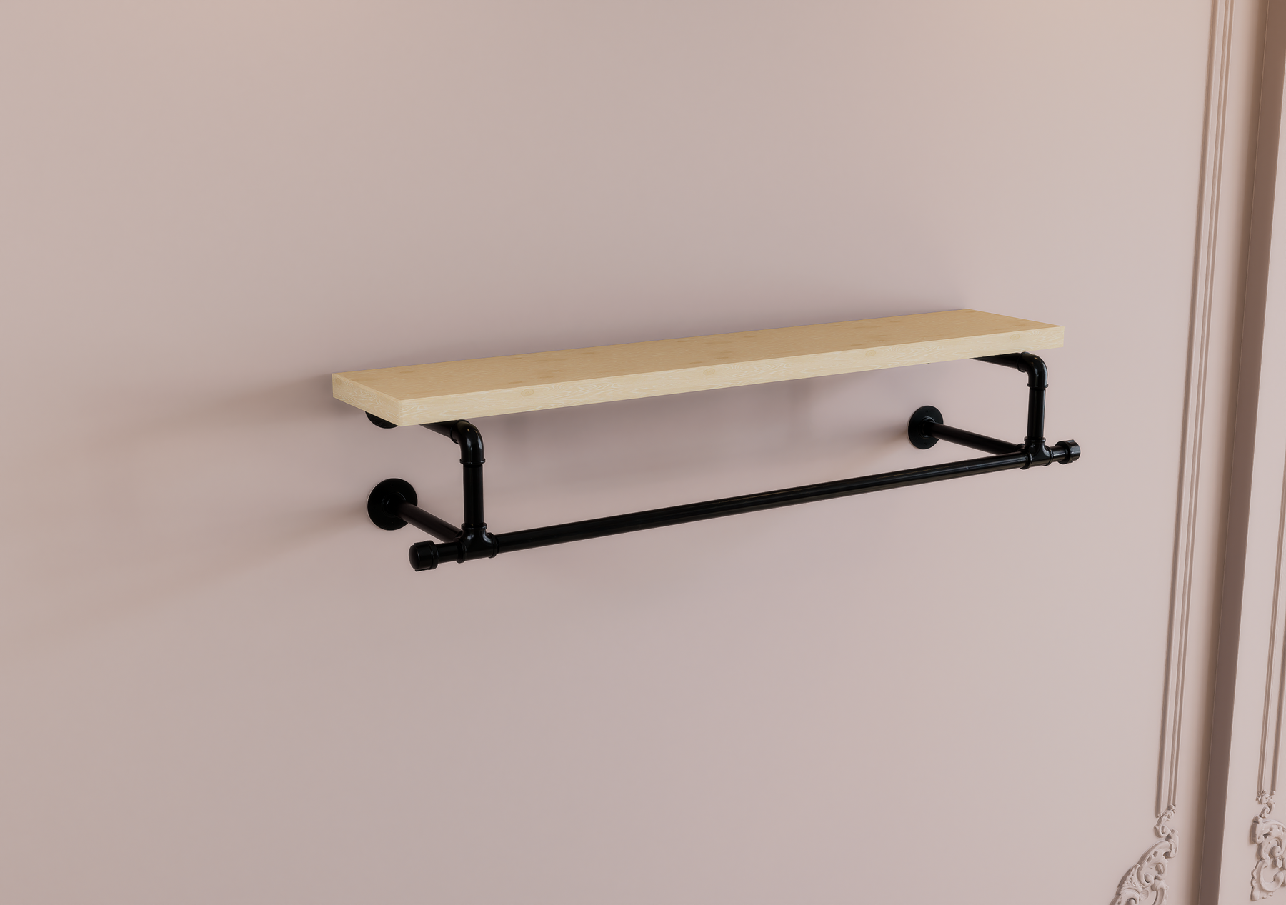 Create your own custom closet or display space with this industrial black pipe clothes rack — featuring two wall-mounted brackets connected by a horizontal hanging rail, and optional shelf support at the top of each bracket.