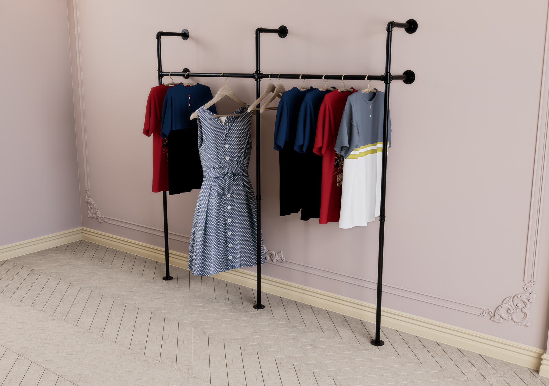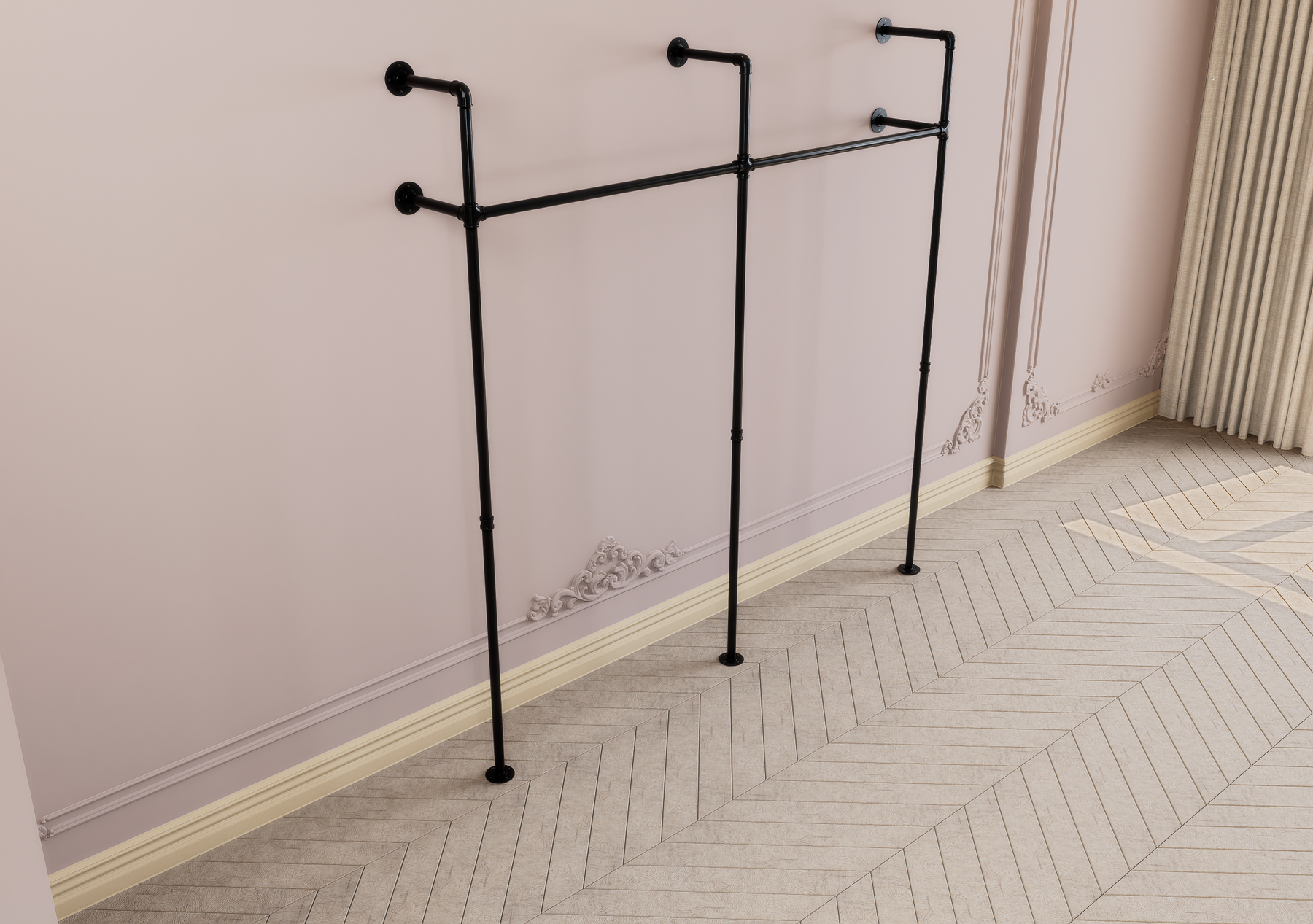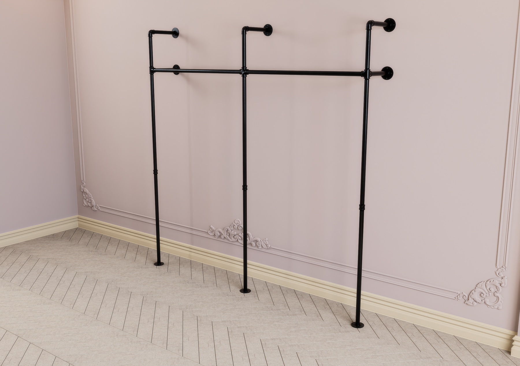 Designed for strength, stability, and serious storage, this reinforced dual clothes rack is built for heavy-duty use and high-impact style. With 8 total securing points (4 wall, 4 floor), it offers unmatched sturdiness — perfect for stylists, shop displays, and long-term closet builds.