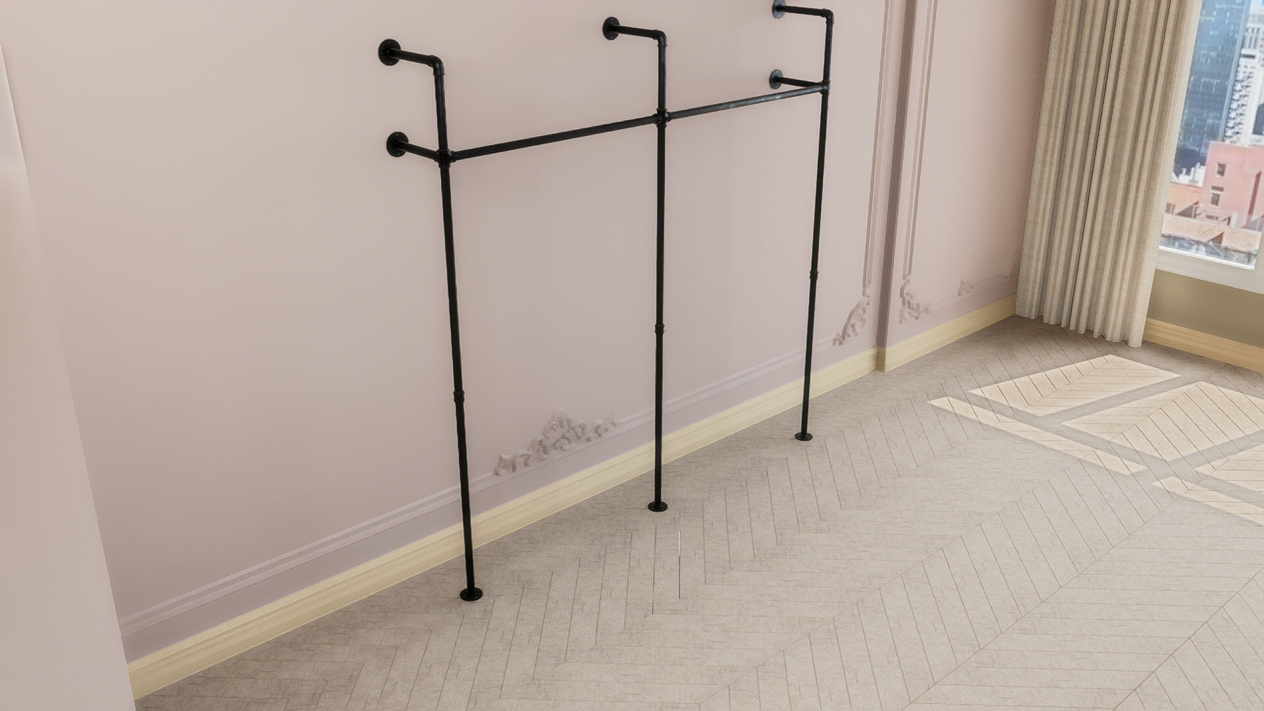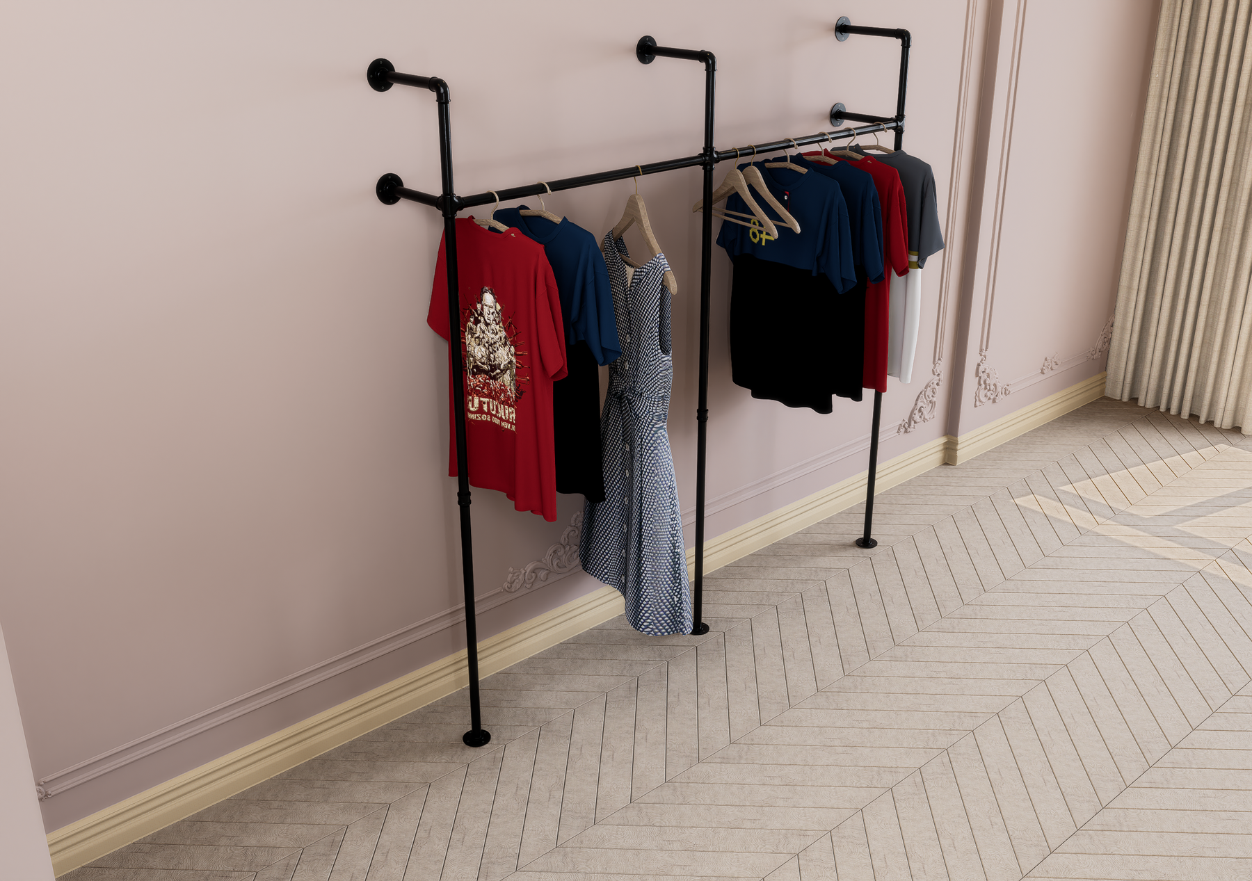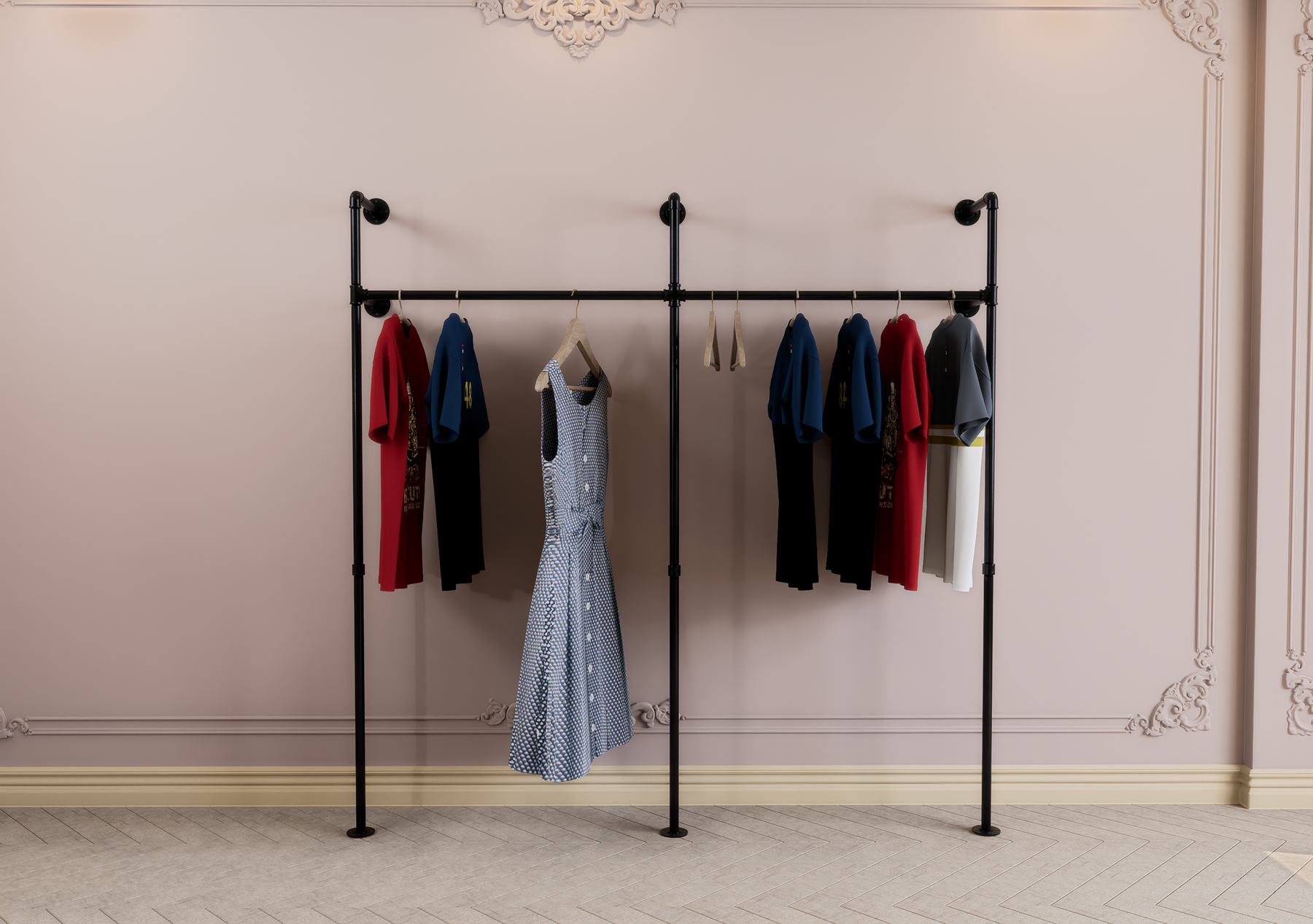 Designed for strength, stability, and serious storage, this reinforced dual clothes rack is built for heavy-duty use and high-impact style. With 8 total securing points (4 wall, 4 floor), it offers unmatched sturdiness — perfect for stylists, shop displays, and long-term closet builds.