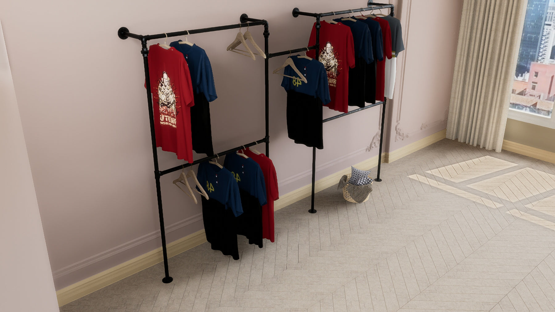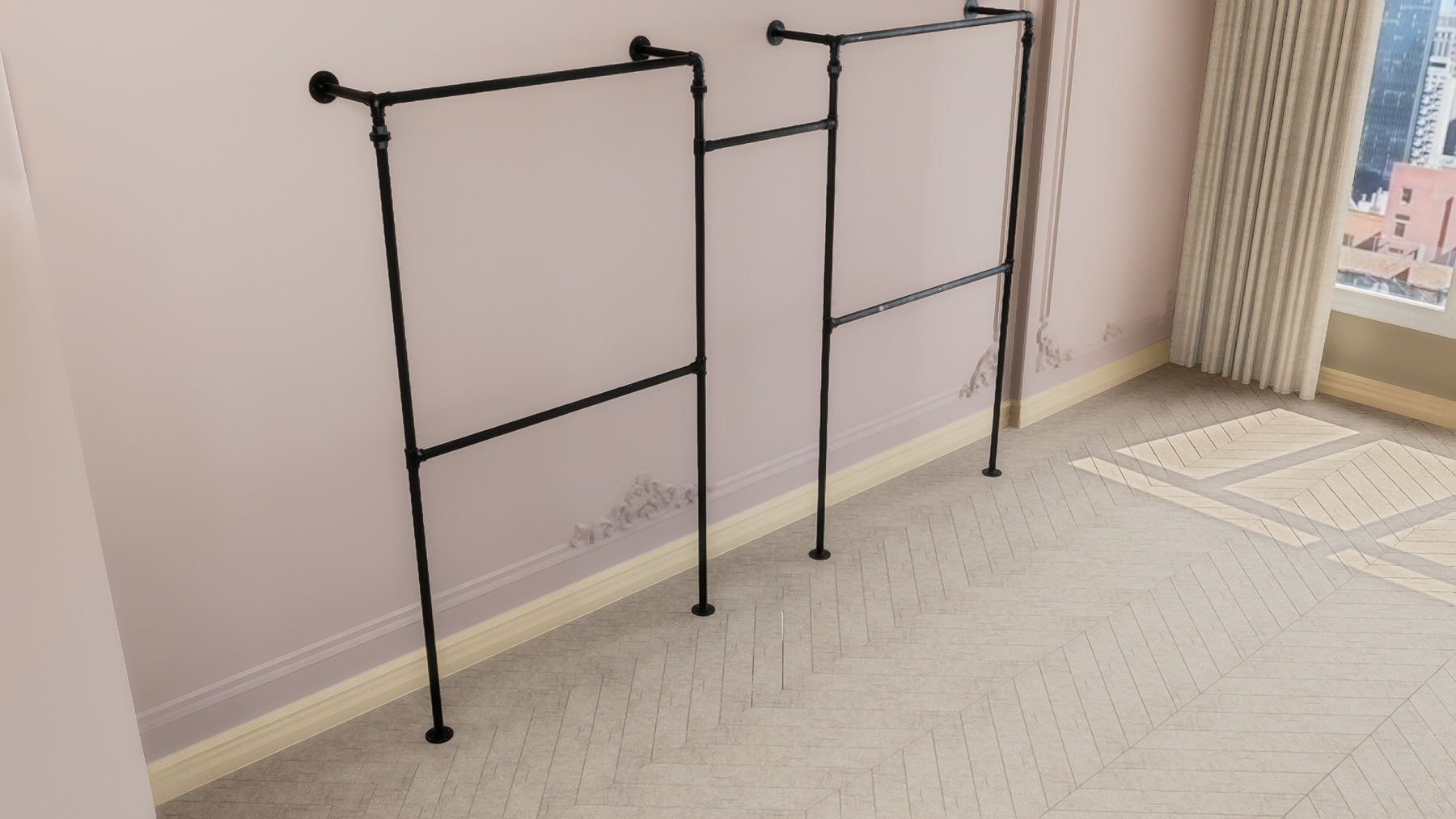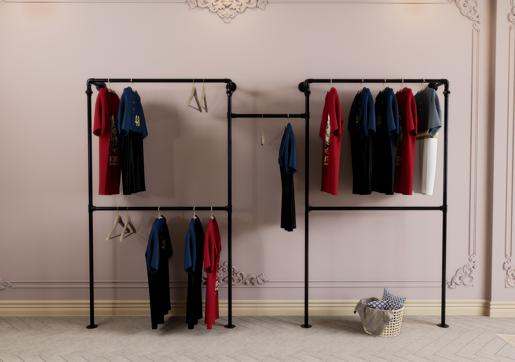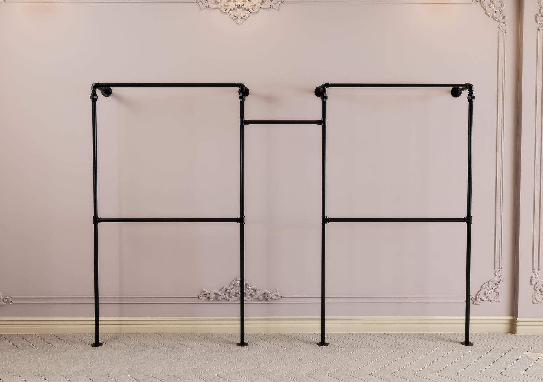 Maximise your storage without compromising on style. This wall and floor mounted pipe clothing rack combines a stunning minimalist design with exceptional practicality. Featuring four sturdy outer squares and a central support pole, it creates an open-concept framework that offers expansive hanging space from edge to centre — perfect for everything from seasonal wardrobes to boutique displays. Each section allows for effortless organisation while maintaining a clean, clutter-free aesthetic.