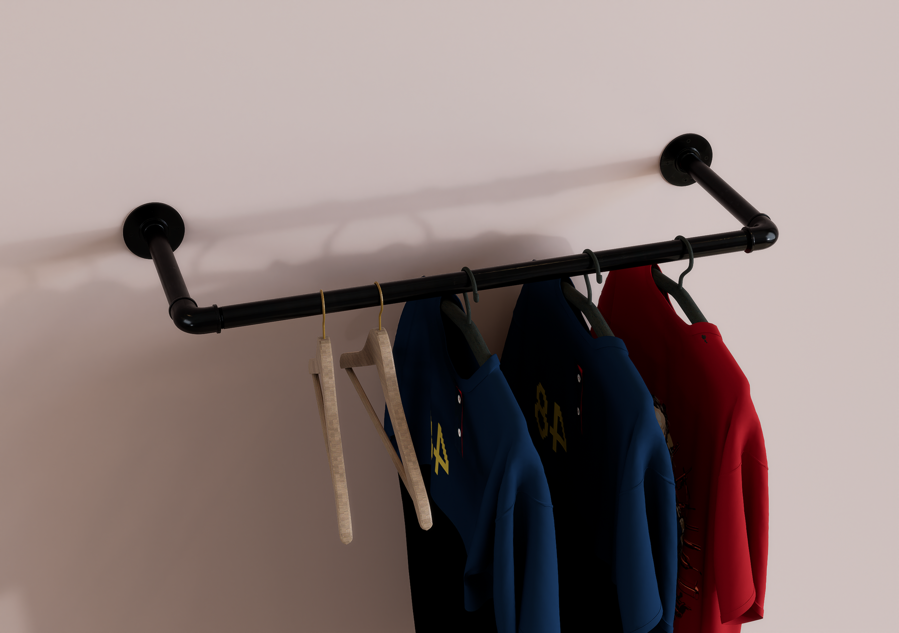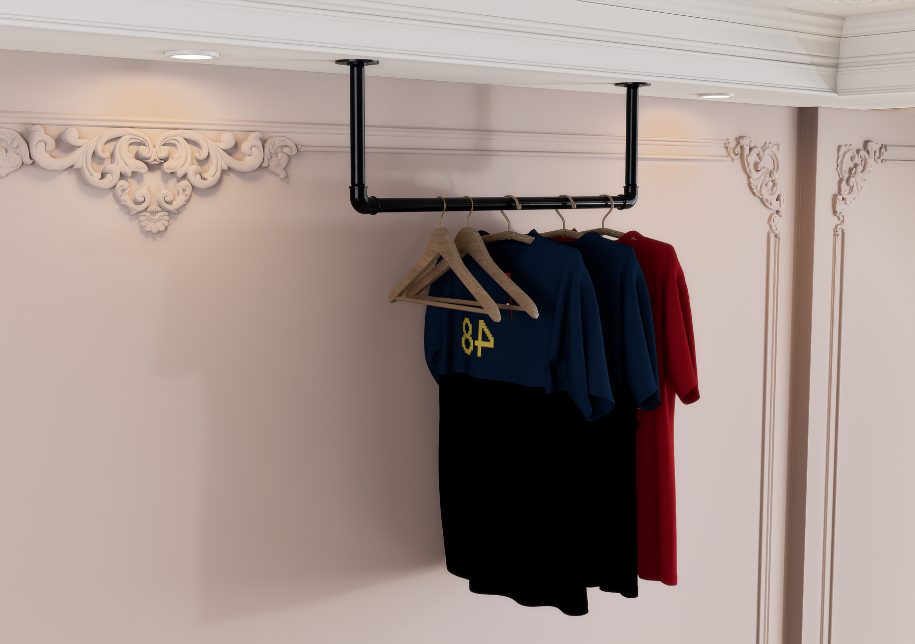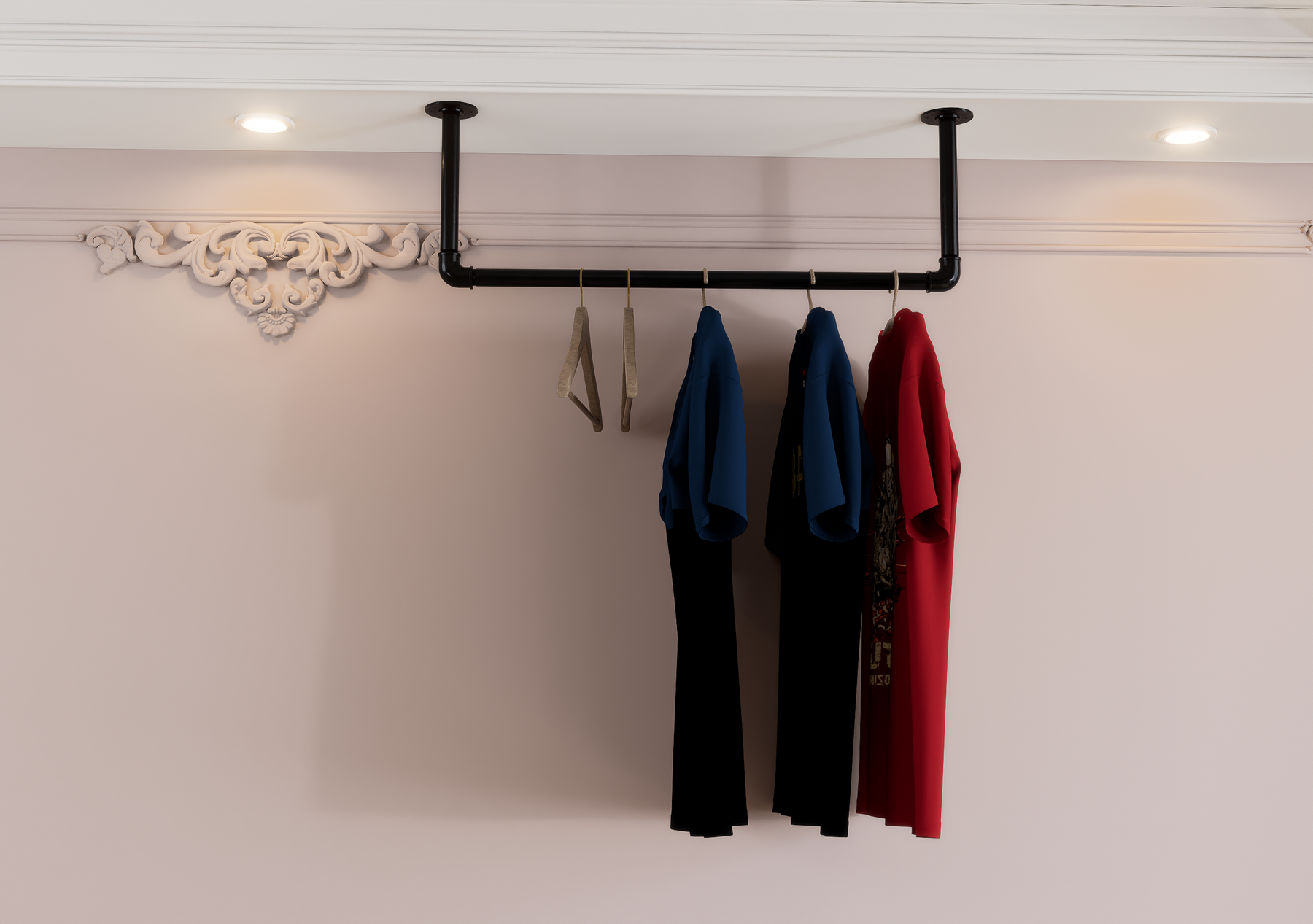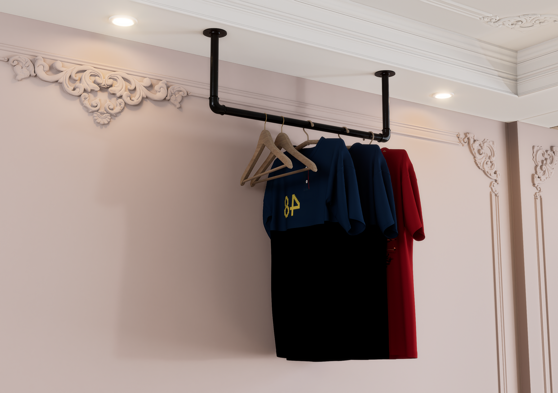 Whether wall-mounted for convenience or ceiling-suspended for boutique flair, this minimalist rail brings rugged charm and modern functionality together seamlessly.