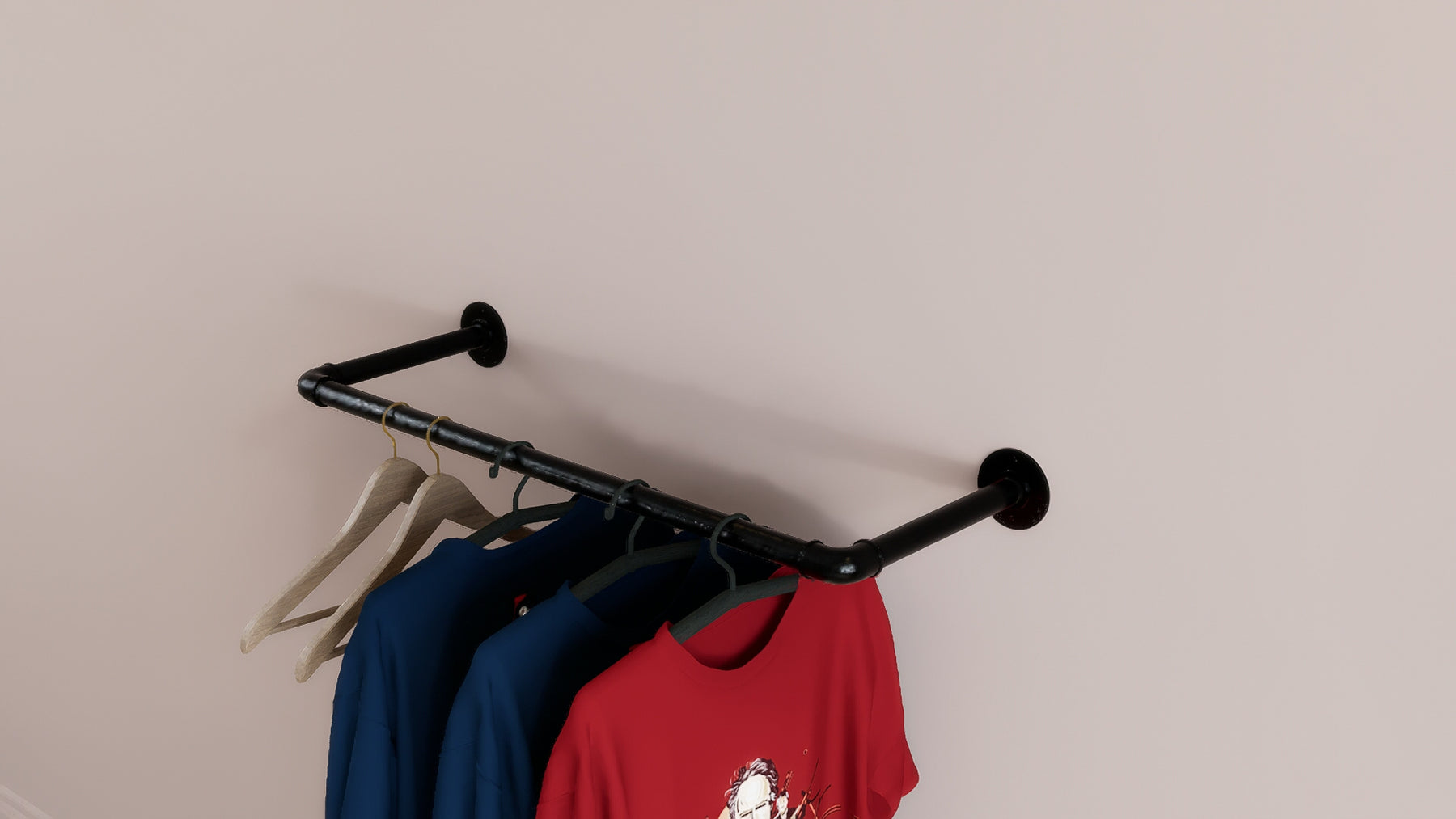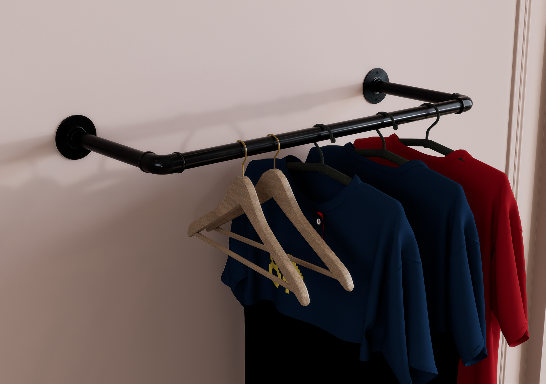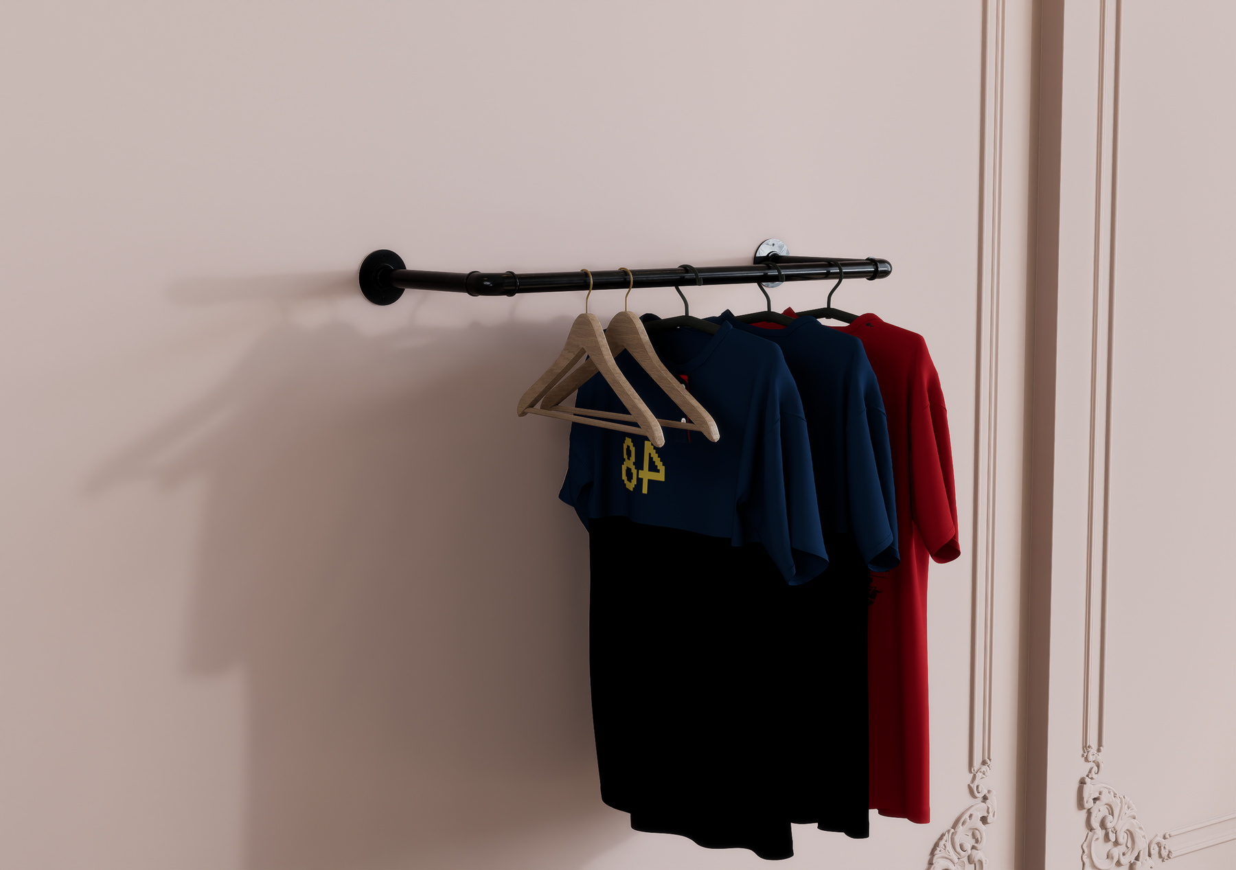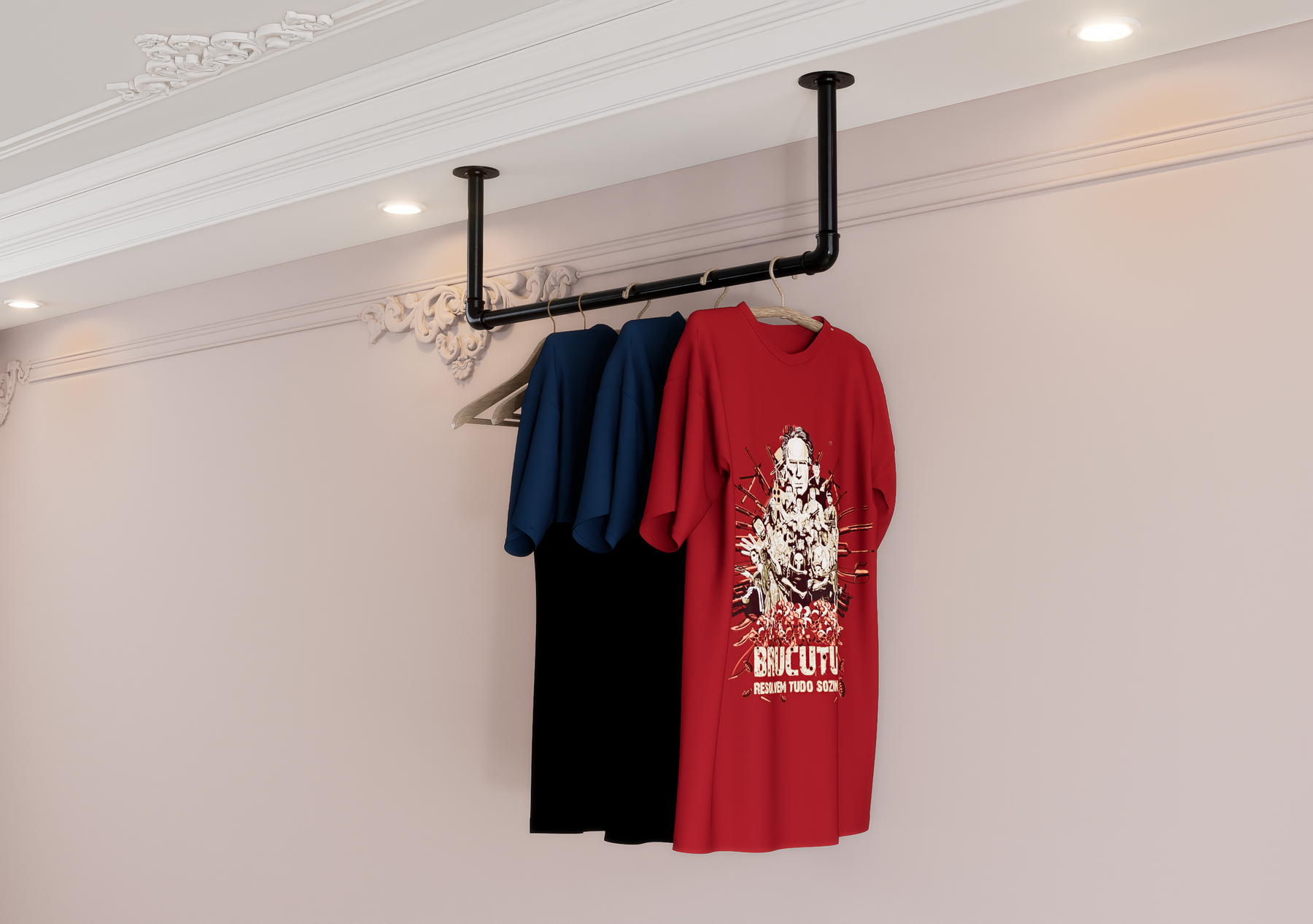 Whether wall-mounted for convenience or ceiling-suspended for boutique flair, this minimalist rail brings rugged charm and modern functionality together seamlessly.