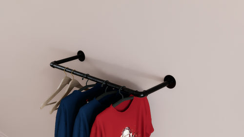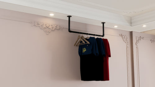 Upgrade your closet or space with this industrial black steel pipe clothes rack, perfect for both wall and ceiling mounting. Built from durable steel with a sleek black finish, it sits 25cm from the wall — providing ample hanging space without bulk.