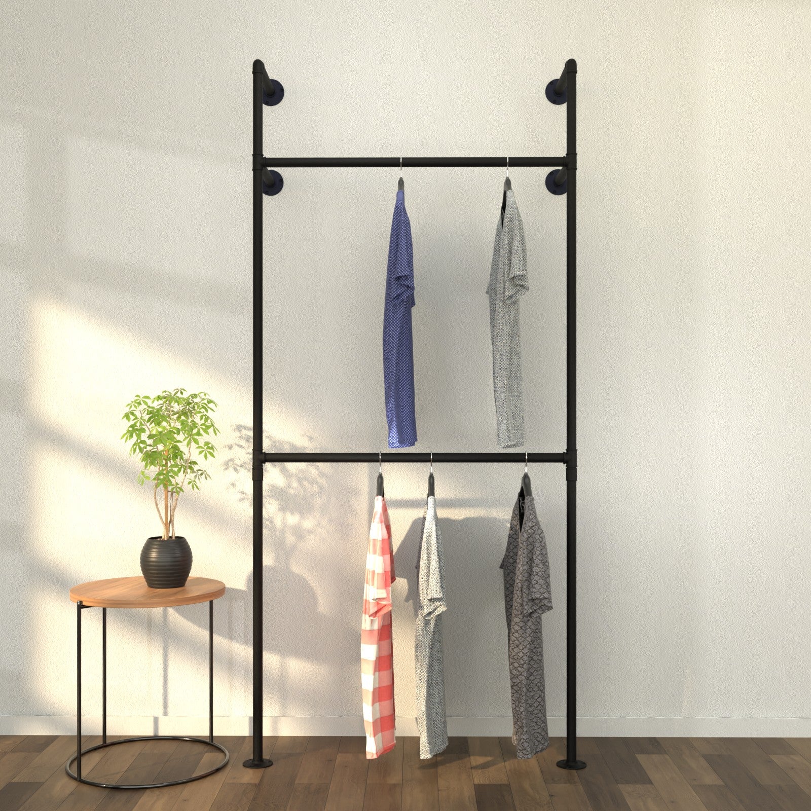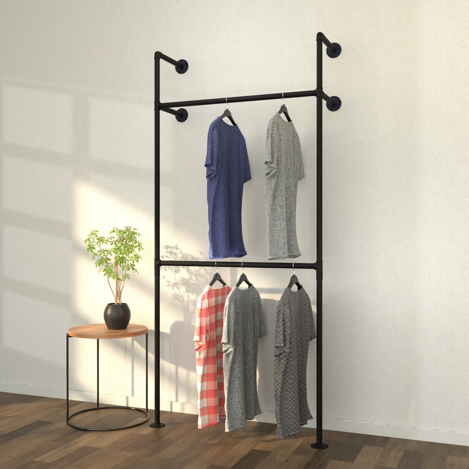 The premium industrial-style clothing rack crafted from durable pipes. A blend of functionality and urban chic, PipeLine is more than just a storage solution; it's a statement piece designed for modern homes. With its robust construction and sleek design, it's the perfect blend of style and strength.
