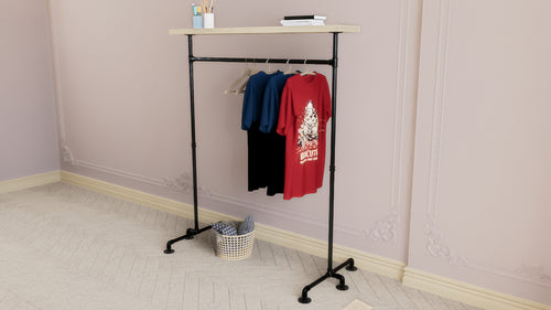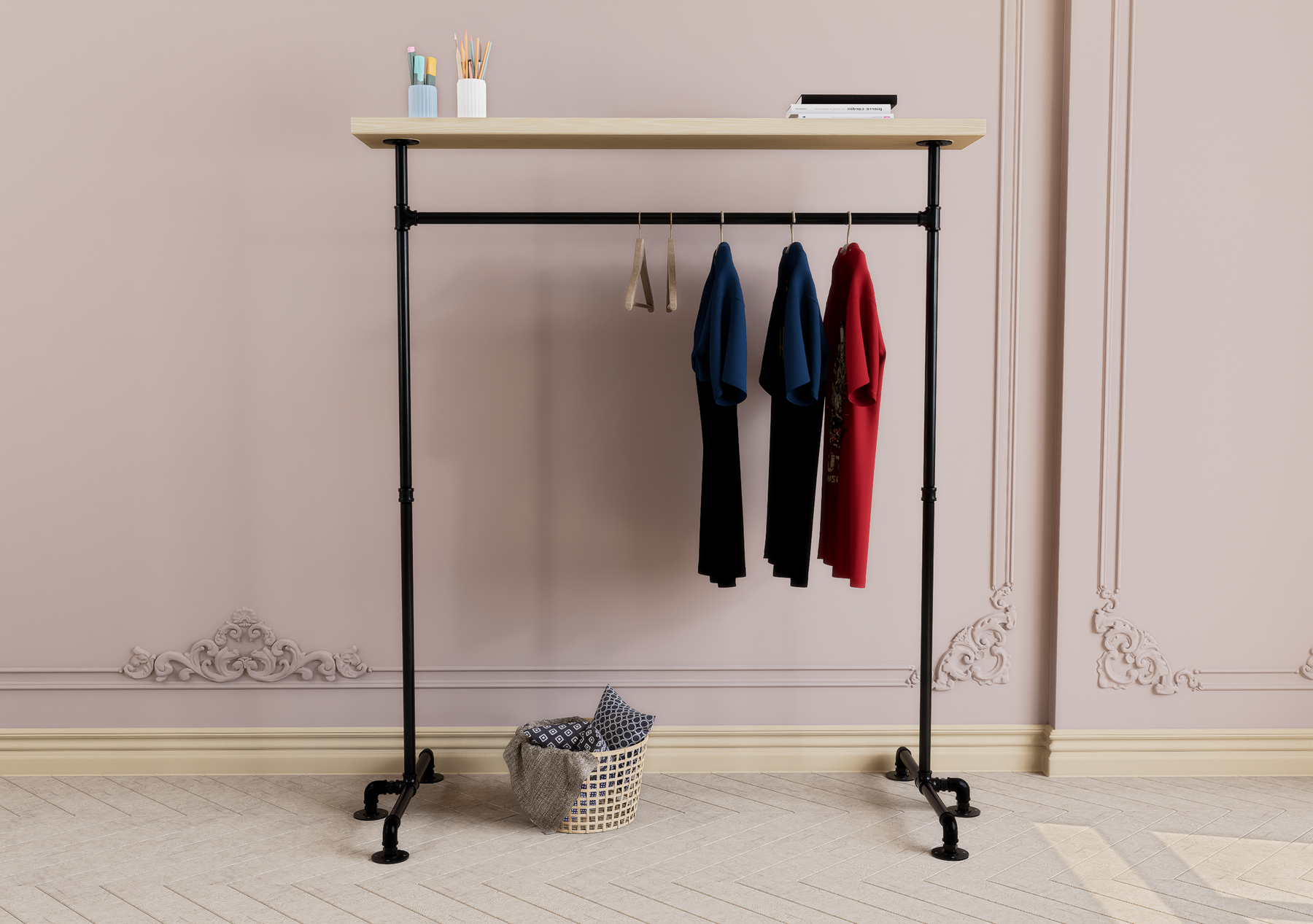 Bring industrial style and versatility to your space with this free standing black steel pipe clothes rack, complete with a top shelf for extra storage or display. Designed for minimalists and modern interiors, this sturdy rack offers ample space for hanging clothes while the upper shelf is ideal for decor, bags, or folded items.