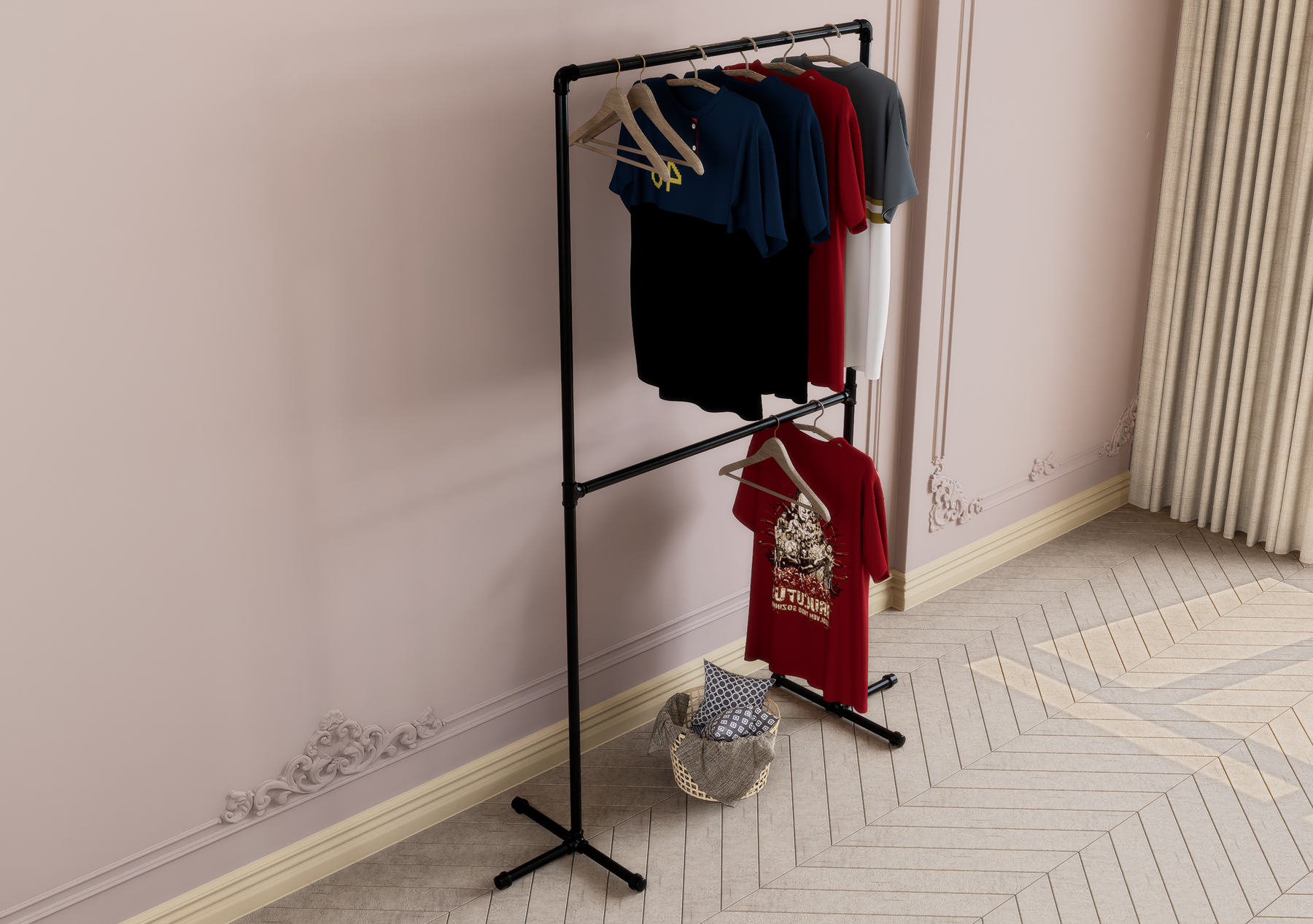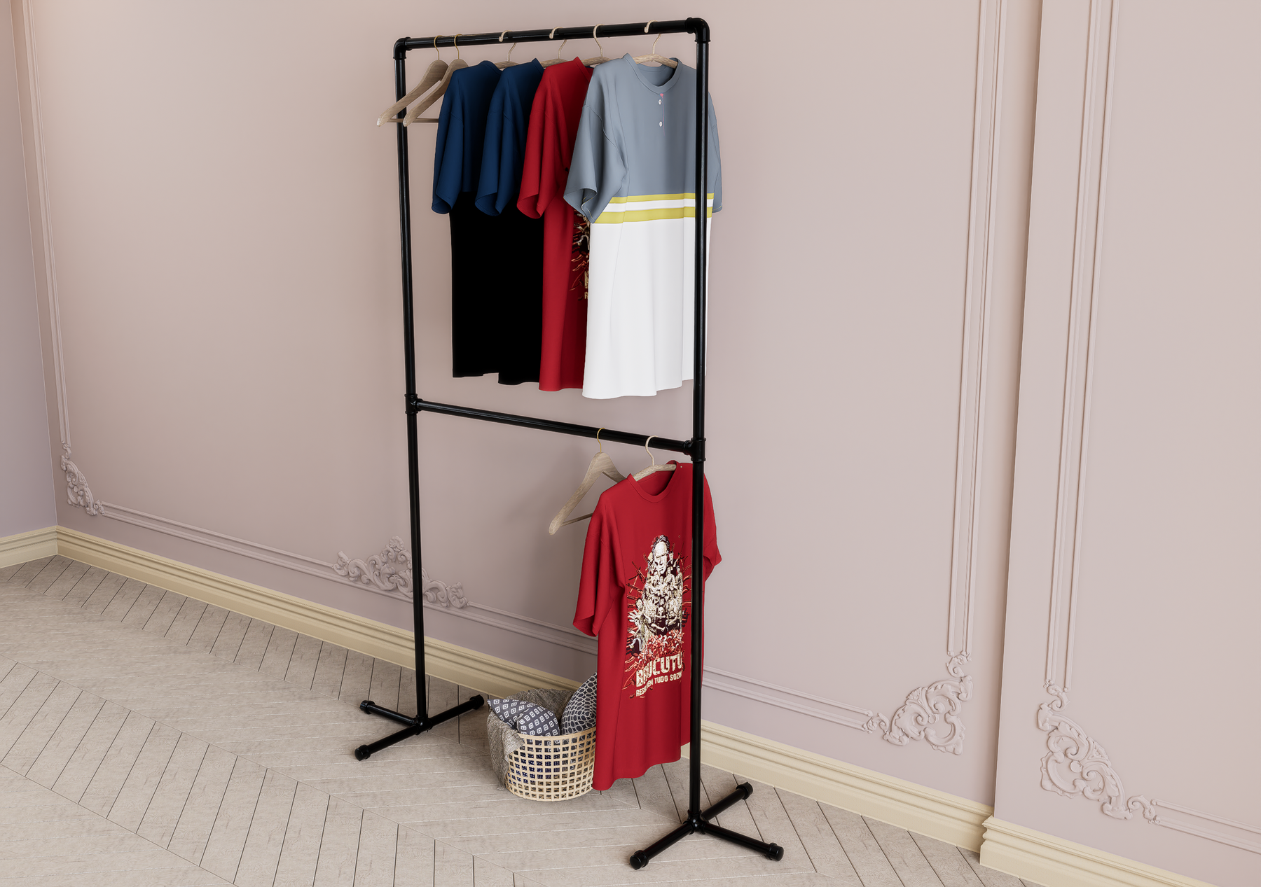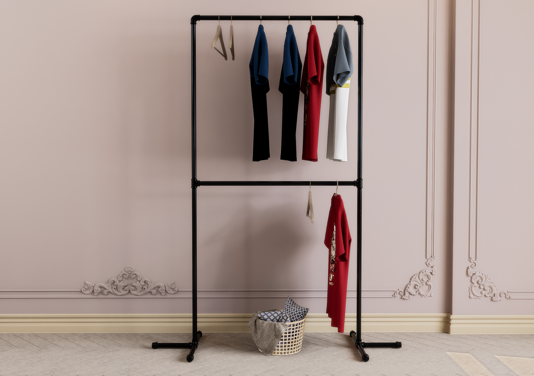 Maximize your vertical space with this sleek double-tier garment rack — a freestanding, minimalist solution ideal for small bedrooms, apartments, and creative studios. Designed for stylish storage and effortless access, this modern metal rack helps you organise garments with elegance and ease.